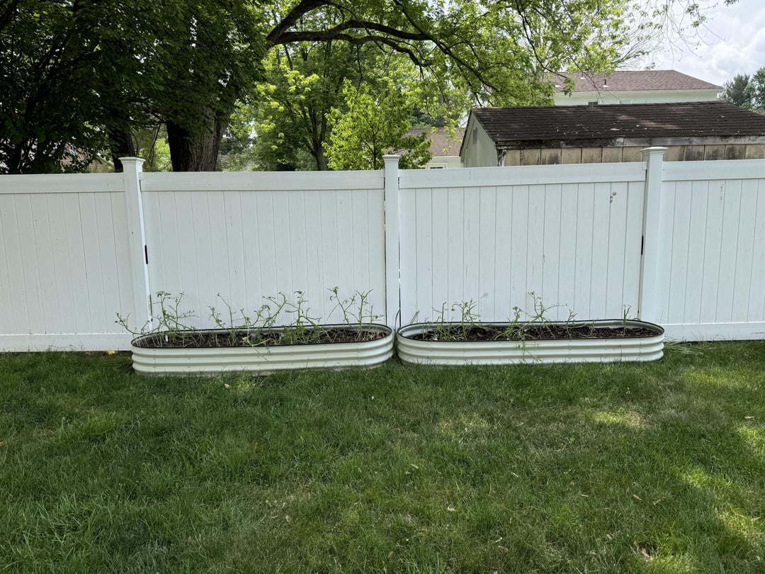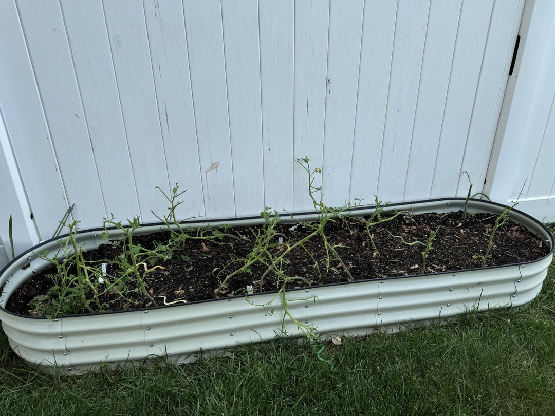 Was just about to trellis them up with some cattle panel behind them and poles in the front. They’re in 8’x2’ beds with 8 plants in each row. About to leave on vacation for a week so just letting them do their thing until I get back. Plan to fertilize heavily with nitrogen to try and promote with leaf growth (the flowers are still looking good!) and mulch before I leave. If they’re still kicking I’ll invest in some kind of netting, otherwise I’ll use this area to plant something else (and maybe still invest in netting?) I don’t have high hopes but the best I can do is get a Plan B rolling.