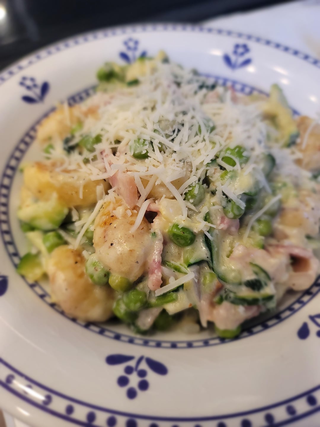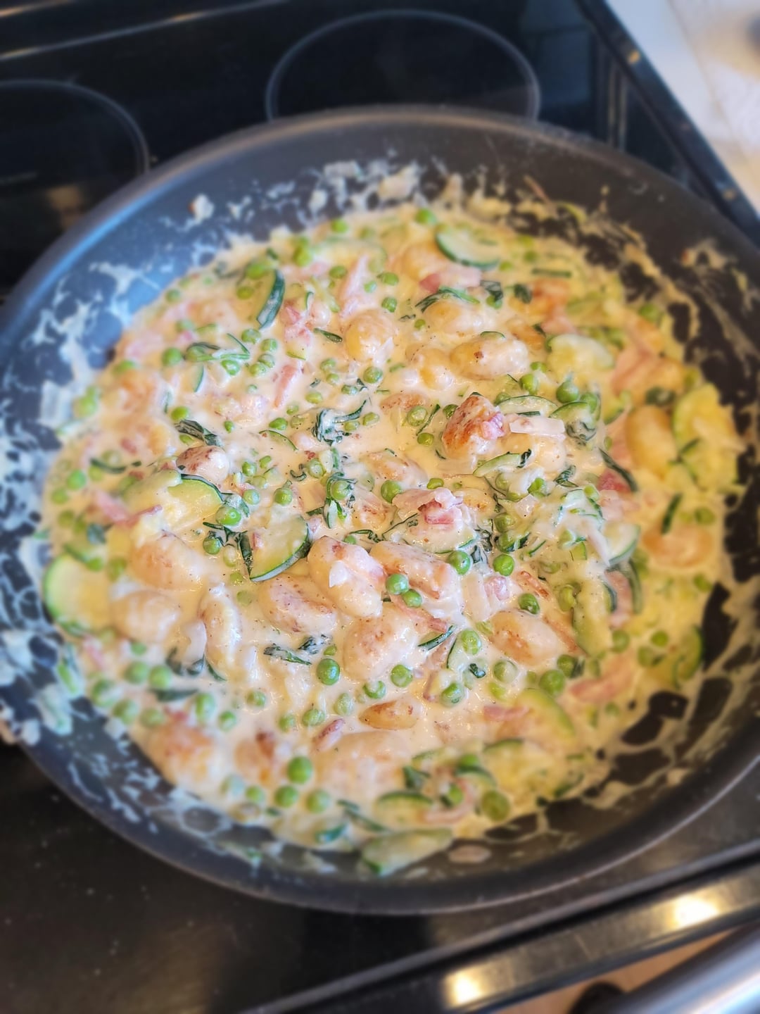 I added 4 strips of bacon, cooked and chopped, and somehow used double the cream cheese (it was supposed to be used in another recipe from this week). The flavour from the bacon and extra creamy sauce made this very rich, but absolutely delicious. I also increased the amount of sweet green peas for extra colour and to balance the richness of the sauce.
