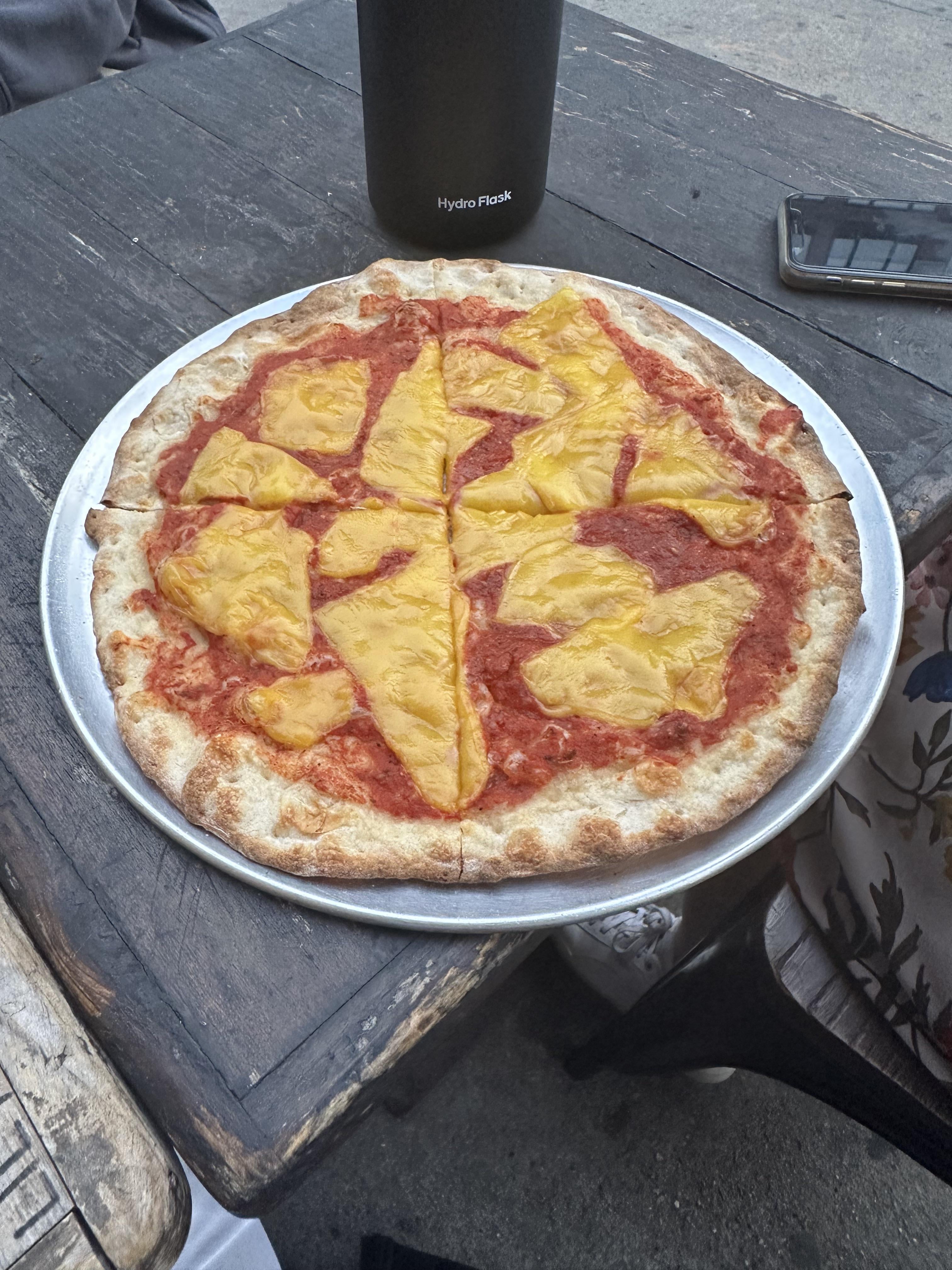 behold, this criminally bad vegan pizza my coworker was served in downtown Manhattan