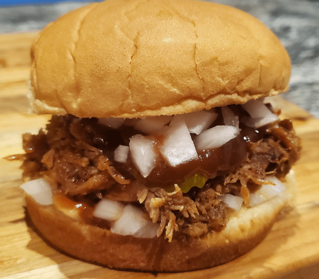 Apple wood smoked pork shoulder, bbq sauce, pickles and loads of diced onions on a potato bun