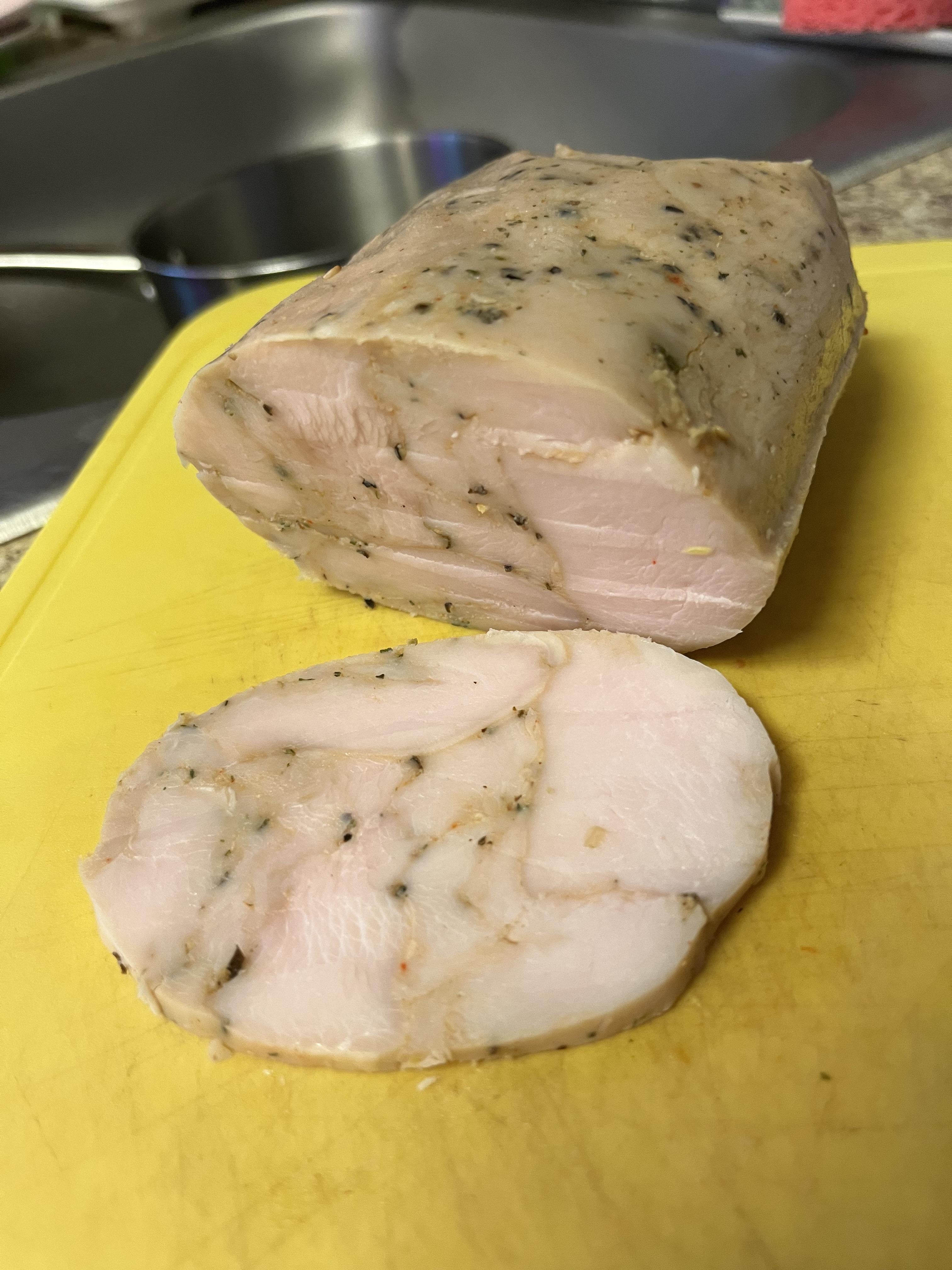 on some peppery steak seasoning, plus a dash of sodium tripolyphosphate (often used to help bind fresh sausage). Kneaded until tacky – this tackiness is protein paste that will glue the loaf together. Then vac-packed and formed into a log shape and SV’d for 2.5 hrs at 139. Chill, slice n serve.