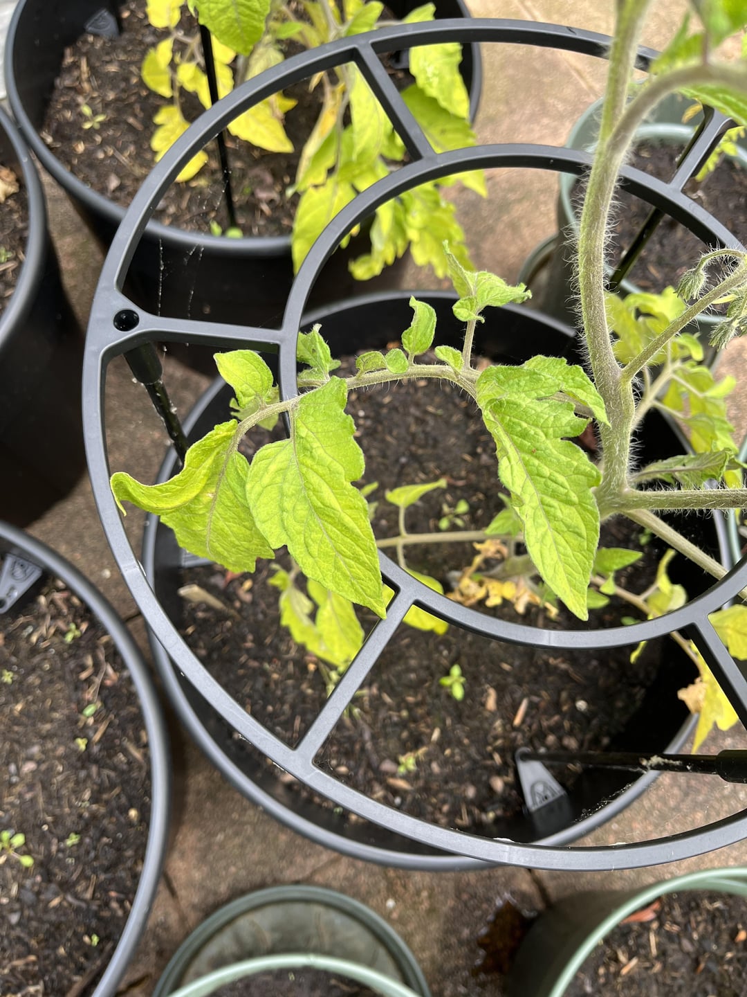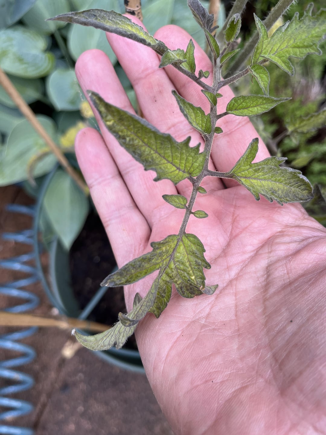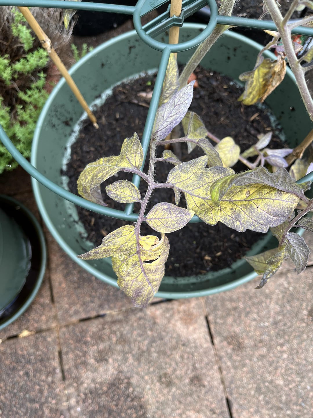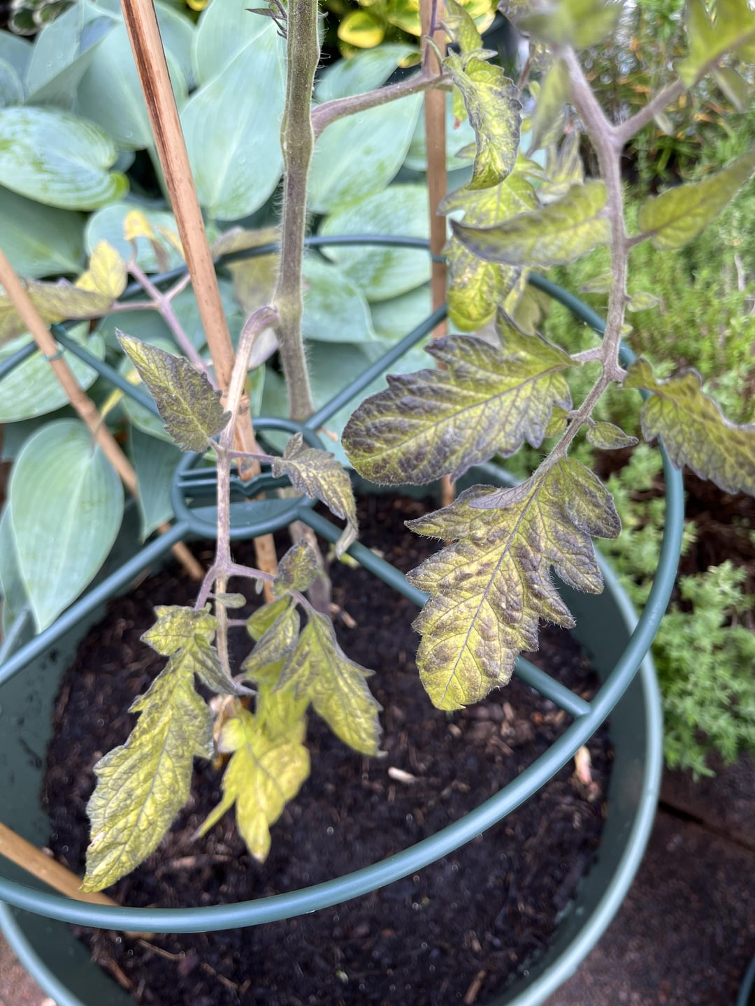 Hi everyone, i have 11 pots of tomatoes, all of which are the same variety and two of them started to give very dark leaves. Anyone knows what the issue might be? The forth photo is one of the healthy plants, posted for comparison.