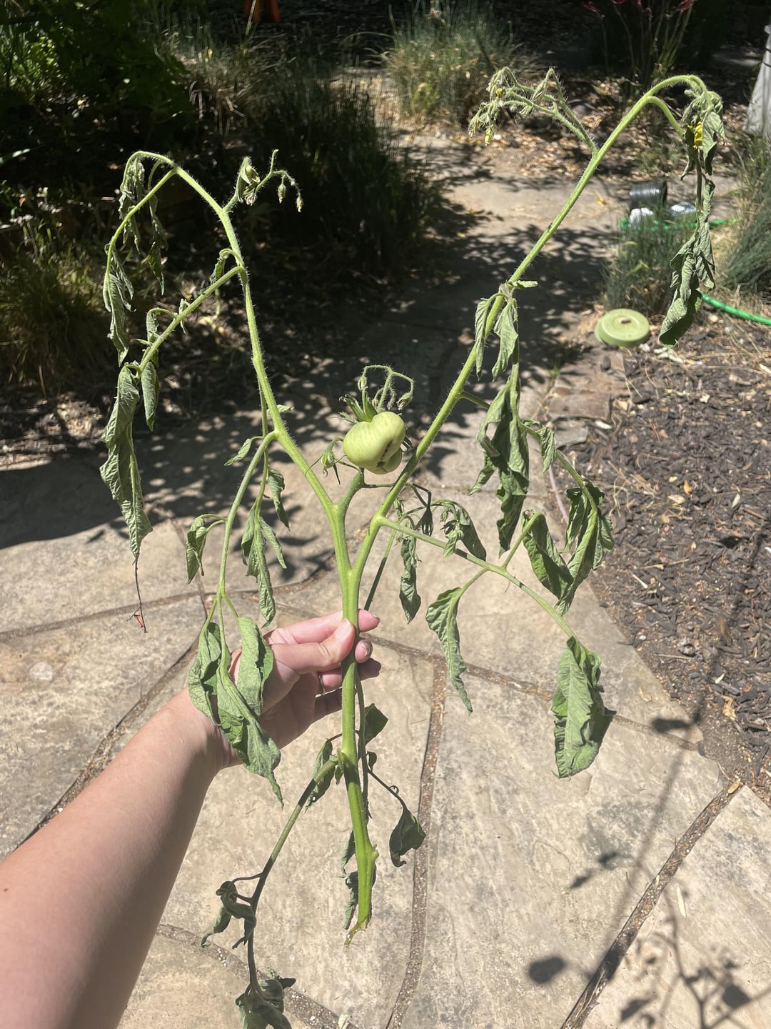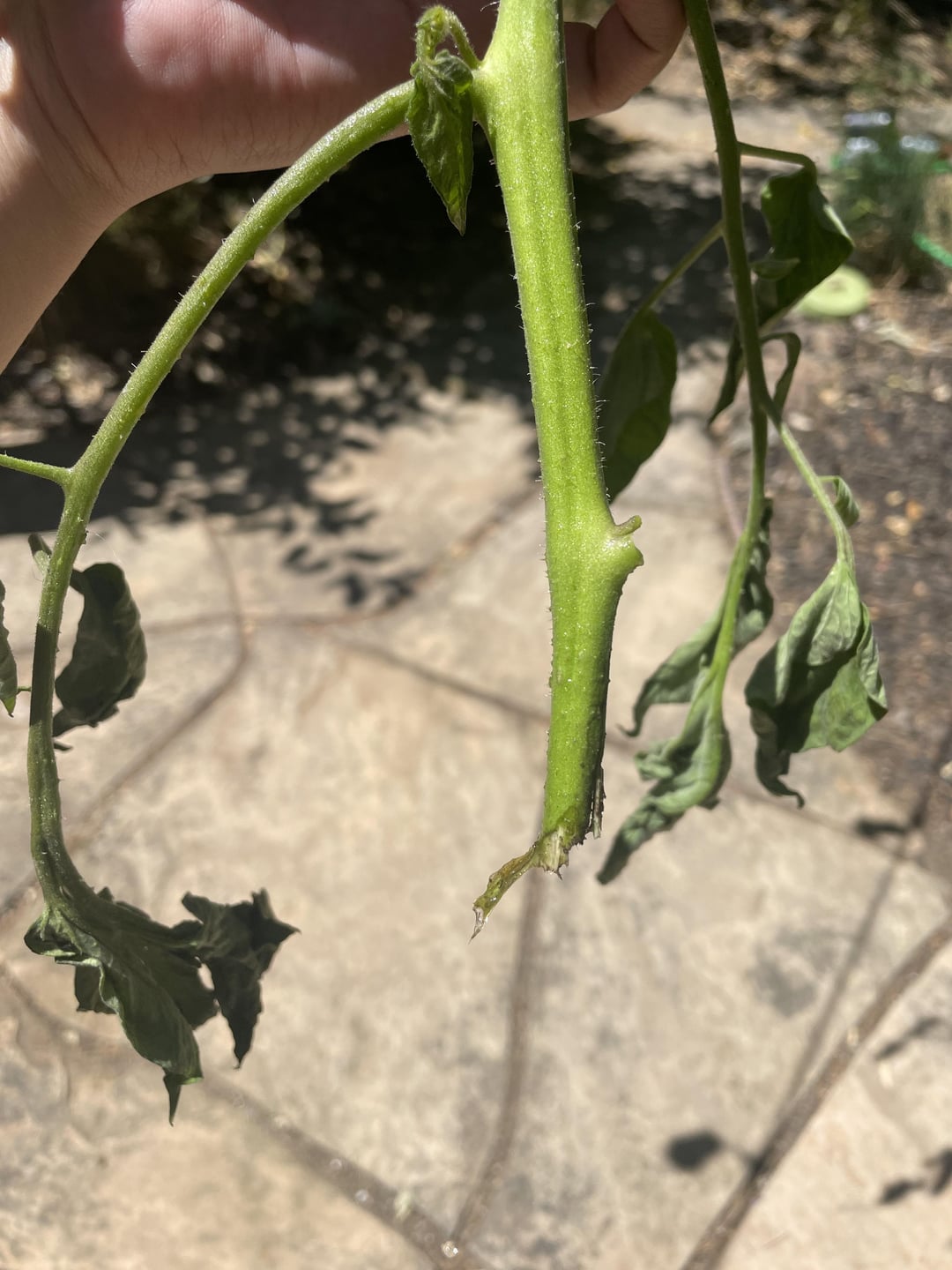 Found one of my tomato plants in my raised garden bed toppled over and out of the ground 😭 it looks like it was eaten from the base of the stem, about half of the plant is gone