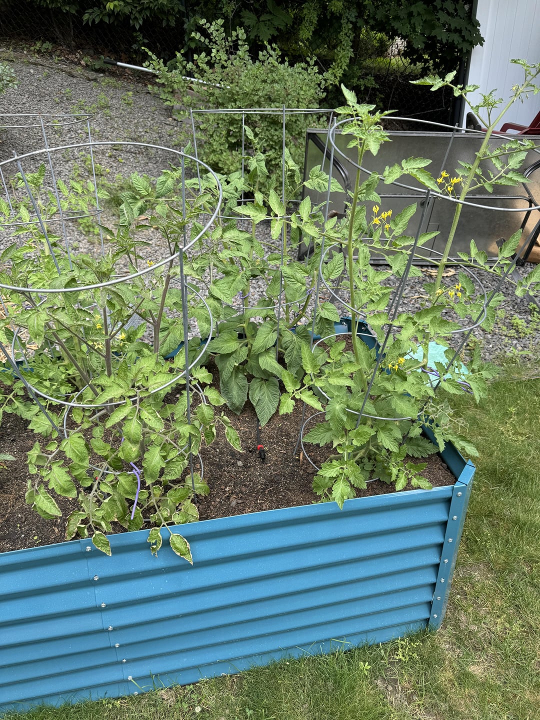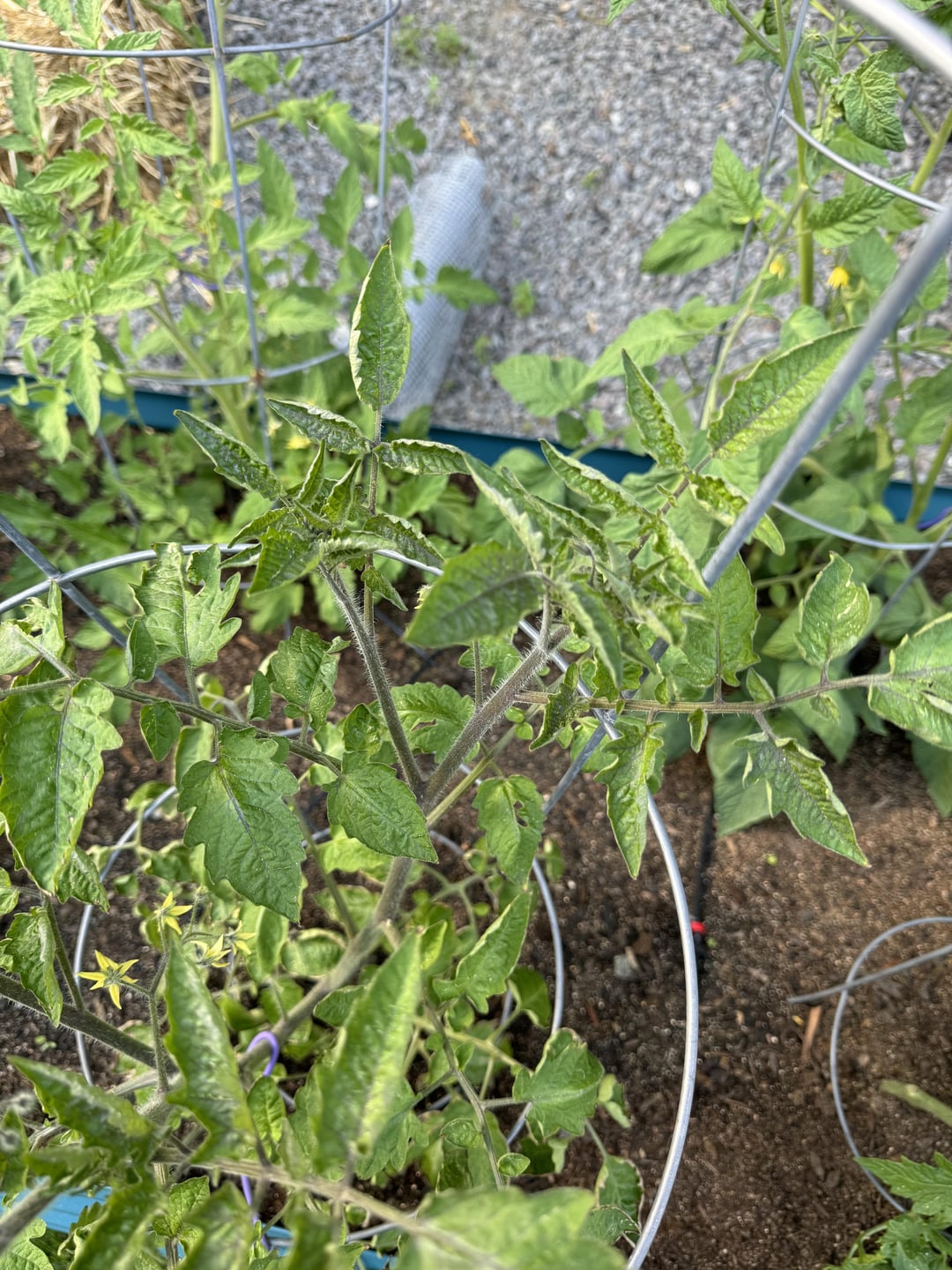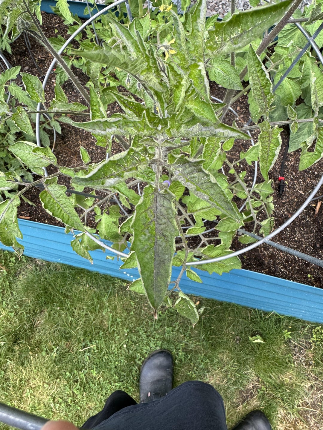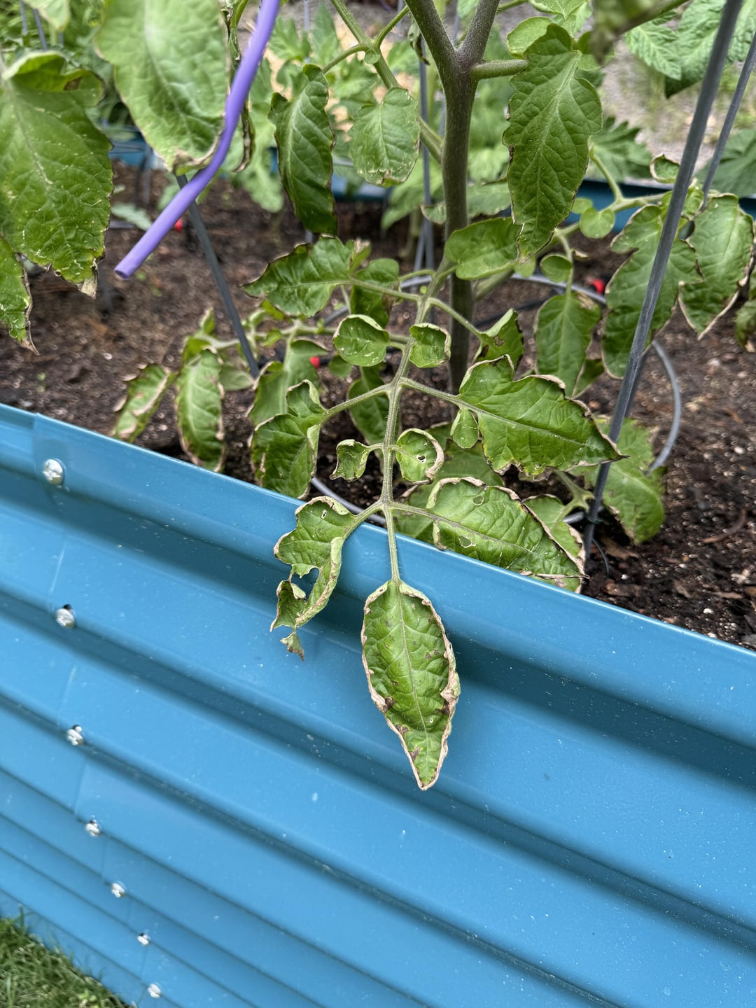 I cannot for the life of me figure out whats wrong with this plant. It shares the raised bed with 5 others that are thriving. At first i thought it was extra thirsty with the brown leaf edges and curling, so i gave it extra water in the afternoon, no change in leaves. Then I thought nitrogen burn, maybe the soil is too hot, but all the other plants show no signs. Is it possible its just a lot more sensitive? If its a disease, should I get it the hell out of there asap? I know it looks fungal, which is probably the right answer here, but the hybrid was bred to be disease-resistant (im not sure that means much, its all relative). If it is fungal/blight, what is the likelihood of it transferring to its neighbors? I was trying to optimize space, hence the two foot deep raised beds filled with the good stuff, but they are spaced closely even while im training them all in an outward direction. If theres even a decent chance of transferrence, ill prob just pull it. When I planted all of them, this one was pretty lime green compared to the others' darker shade so maybe it was underfed and is now reacting? It has set one tiny fruit so far, is in photos, also has three healthy looking flower clusters above that. Lastly, the new leaves are quite dark along their veins.