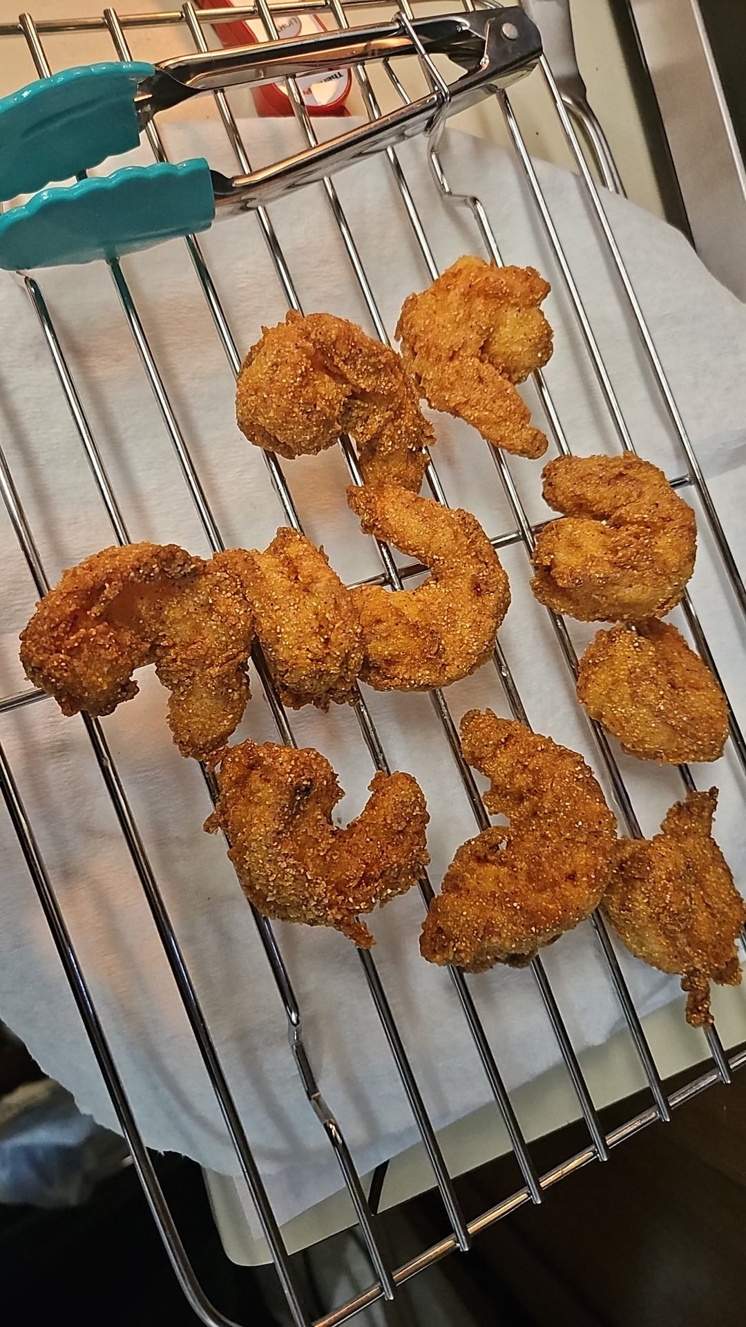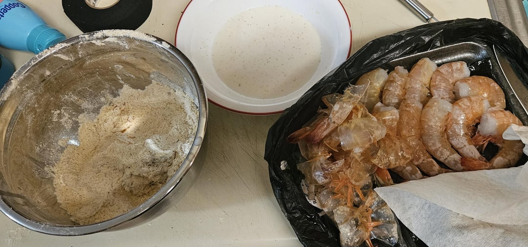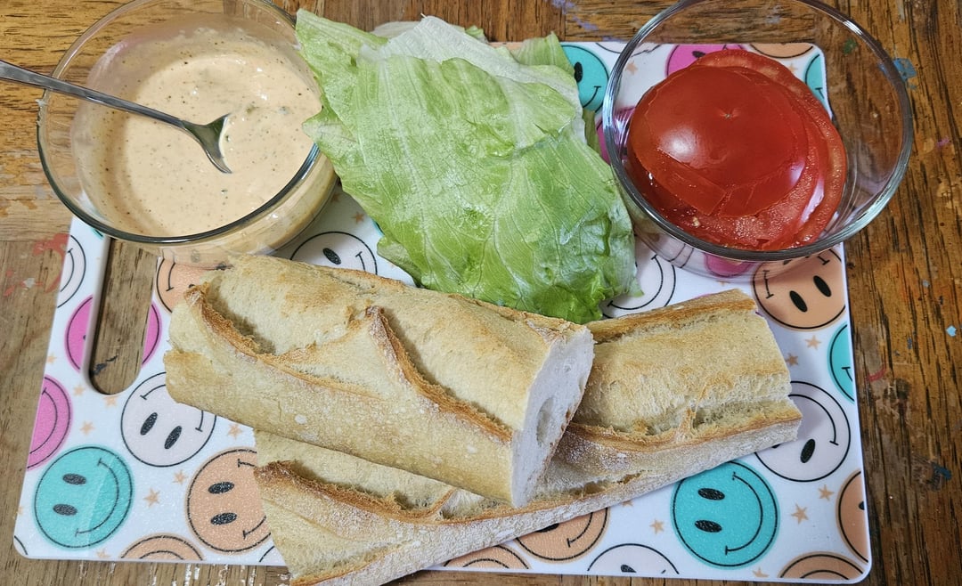 I mixed up around a cup of cornmeal, a little over a cup of flour, and maybe 3T of Tony's. I then mixed about 2T Greek yogurt and 1/3c or so of milk (since I didn't have buttermilk). I used fresh shrimp (lucky that there's a place that flies fresh seafood from the coast daily – quite the luxury in the midwest!) and coated in the flour, then milk, then back in the flour, and fried at 350° about 80 seconds/side. Off to drain, while I made some remoulade: 1/3c mayo, maybe 2T crystal, and a small spoonful of dill relish (I know that's sure to upset some folks, but I saw it somewhere awhile back, and it's pretty good – really simple!), toasted my fresh baguette (we have a great bakery in town) in some butter, slathered some of that remoulade on both halves, and topped with shredded lettuce, sliced tomato and piled the shrimp on there. As Guy Fieri would say: this thing was bananas!!