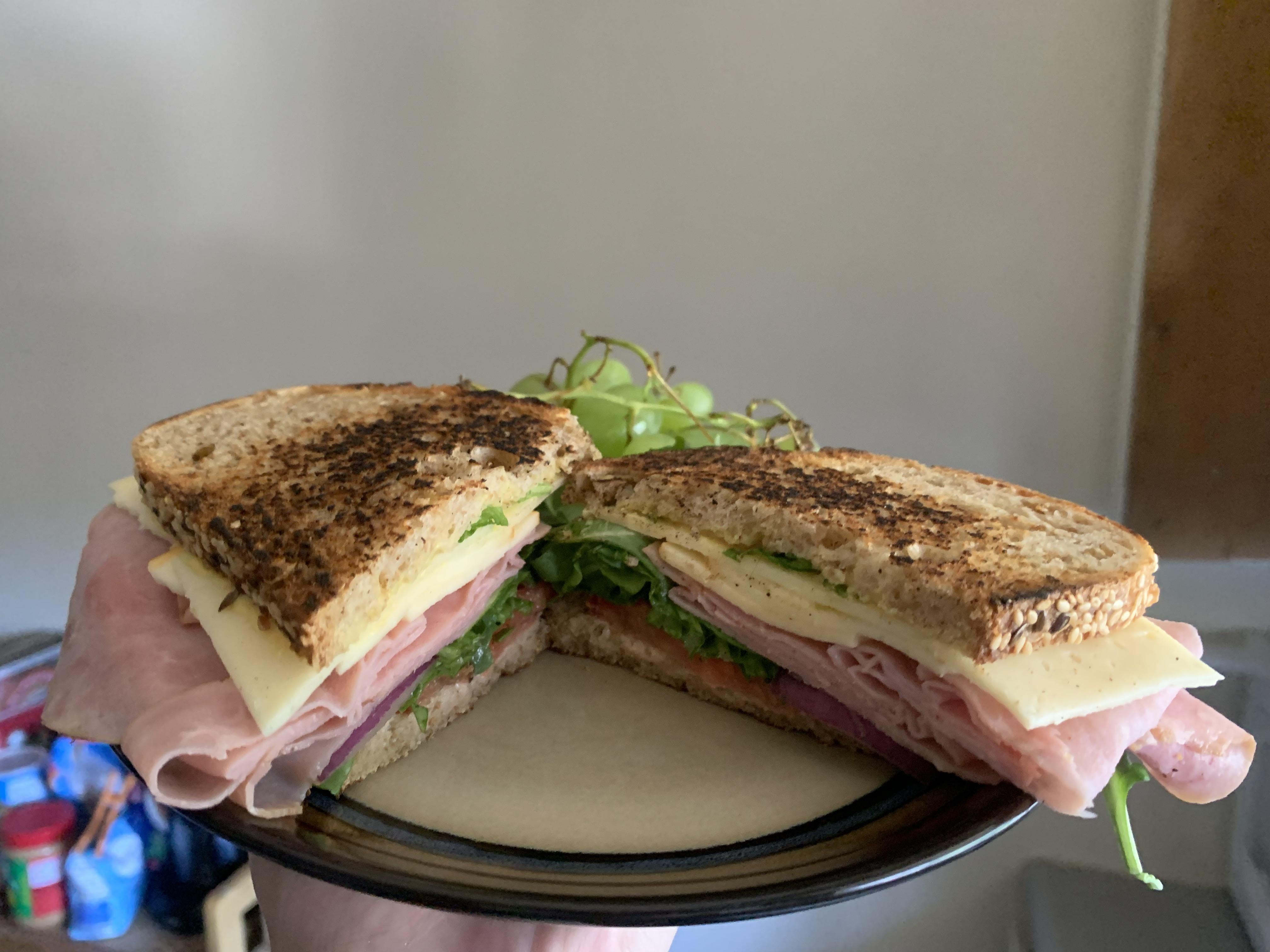 Top to bottom: seeded sourdough toasted on one side, Dijon mustard, havarti cheese, Muenster cheese, honey ham, arugula, onion, tomato, kewpie mayonnaise, more single-side toasted seeded sourdough + a pile of green grapes