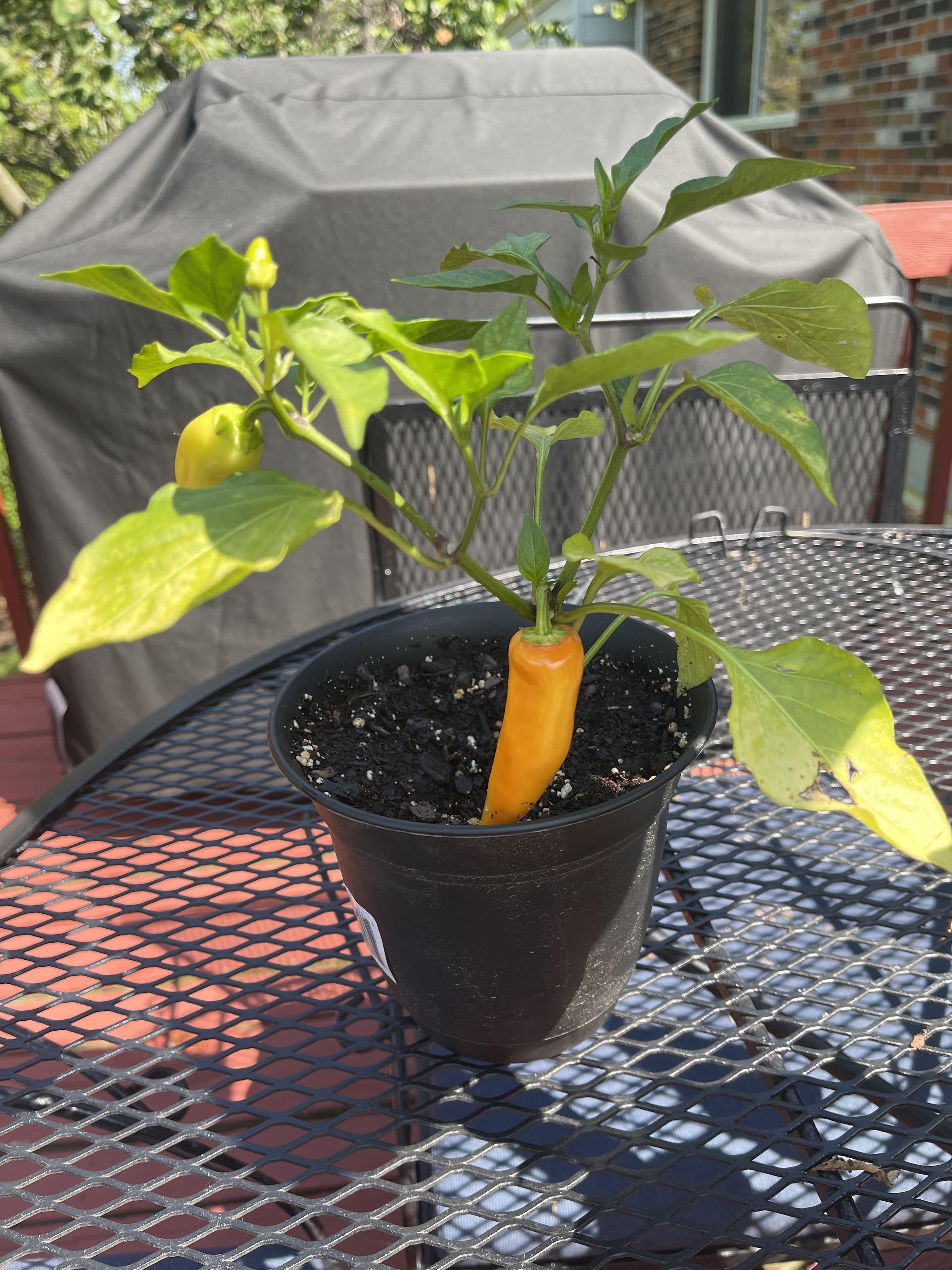 I thought it was a jalapeño but it never really got dark green, it went from the color of the smaller one in the top left to this orange color, and looks too long to be a habanero.