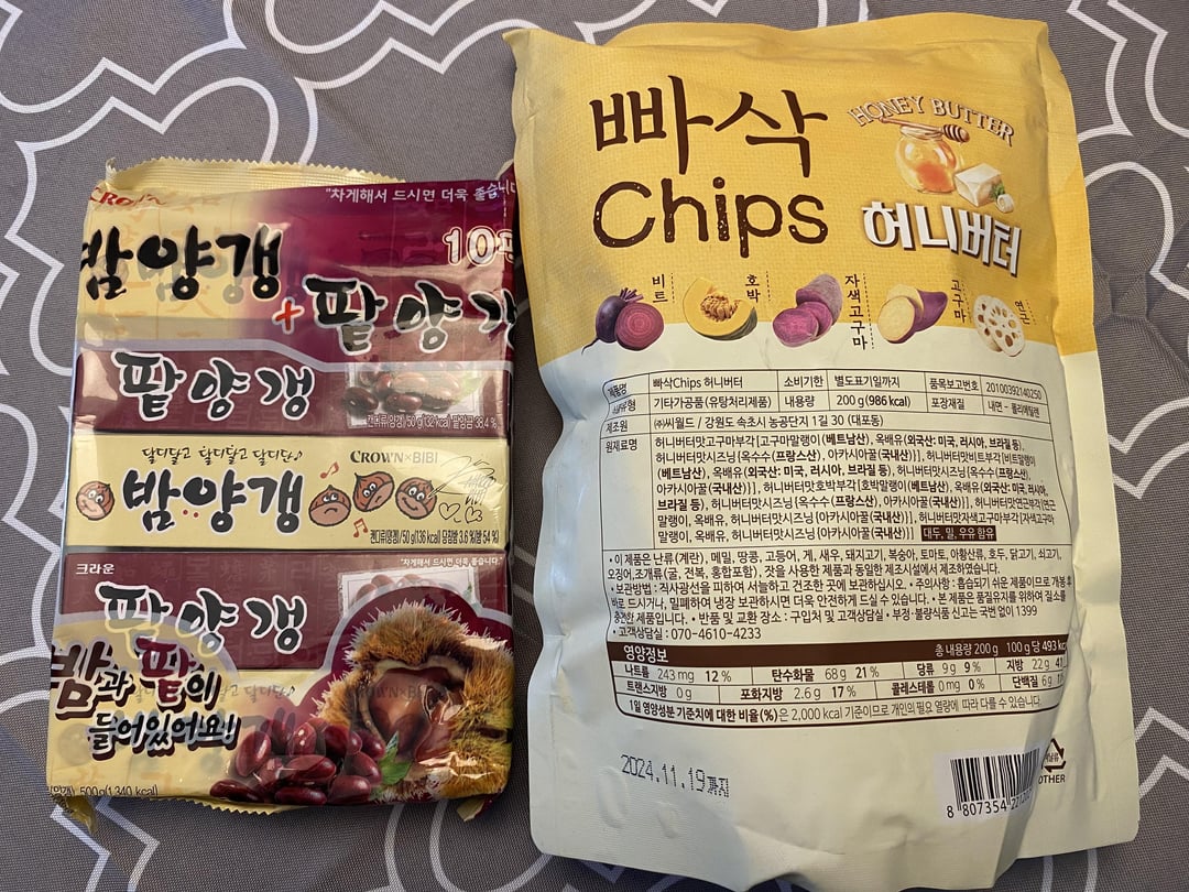 Check for the text 밀 함유(“contains wheat”) that’s been highlighted in the ingredients list. Also check if the snacks were produced in a factory mill that also deals with wheat, barley, etc., which is often included in the description. Judging by the ingredient lists I found in Korean, the chestnut + red bean yanggaeng (coagulated agar agar “jelly”) and the drinks appear to be wheat-free, although I don’t know down to the details like corn syrup are GF certified.