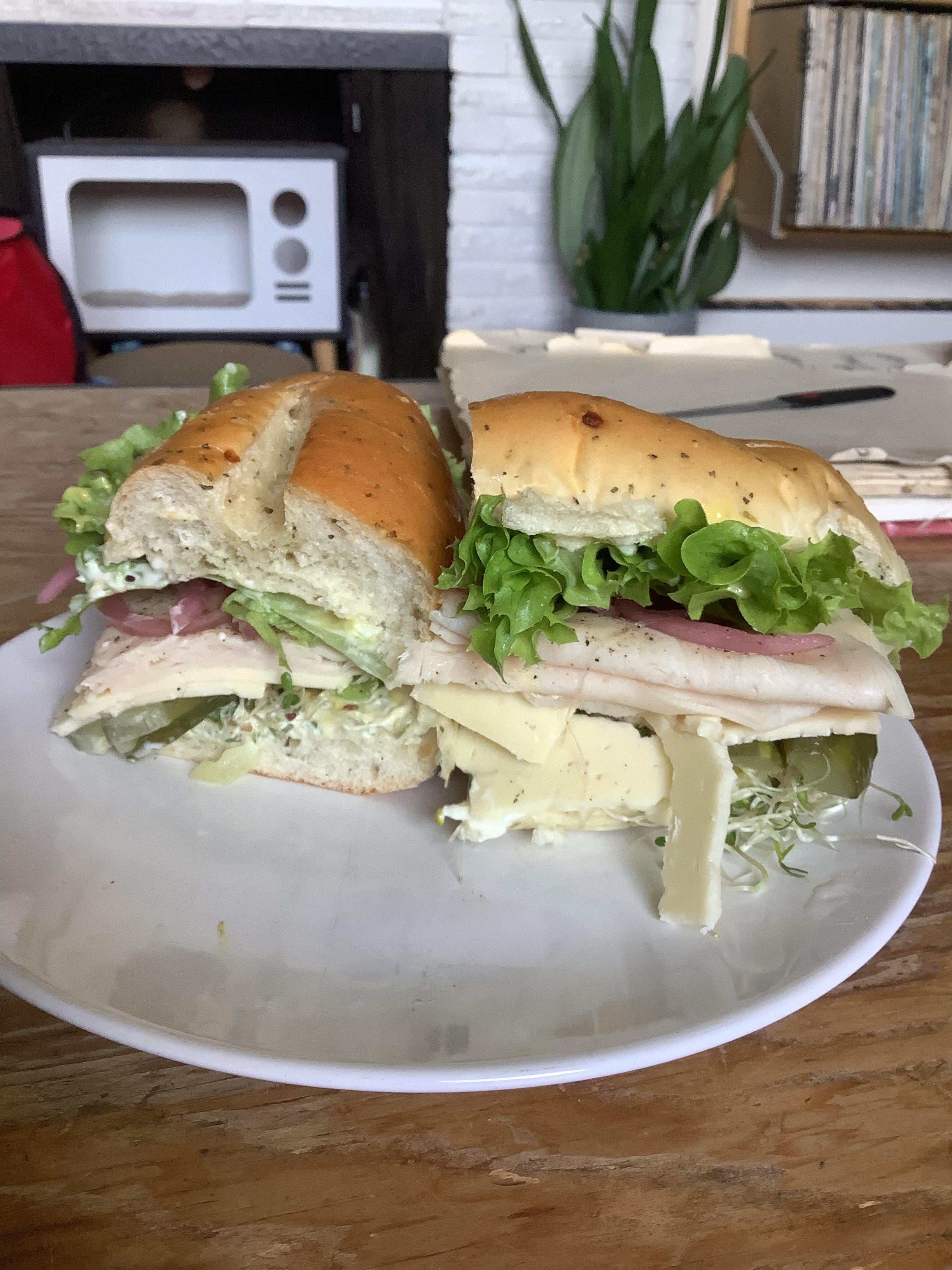 More of the same: smoked chicken, havarti, pickled red onions, dill pickles sprouts & lettuce with mustard, mayo & S&P by brownishgirl Write A CommentYou must be logged in to post a comment.