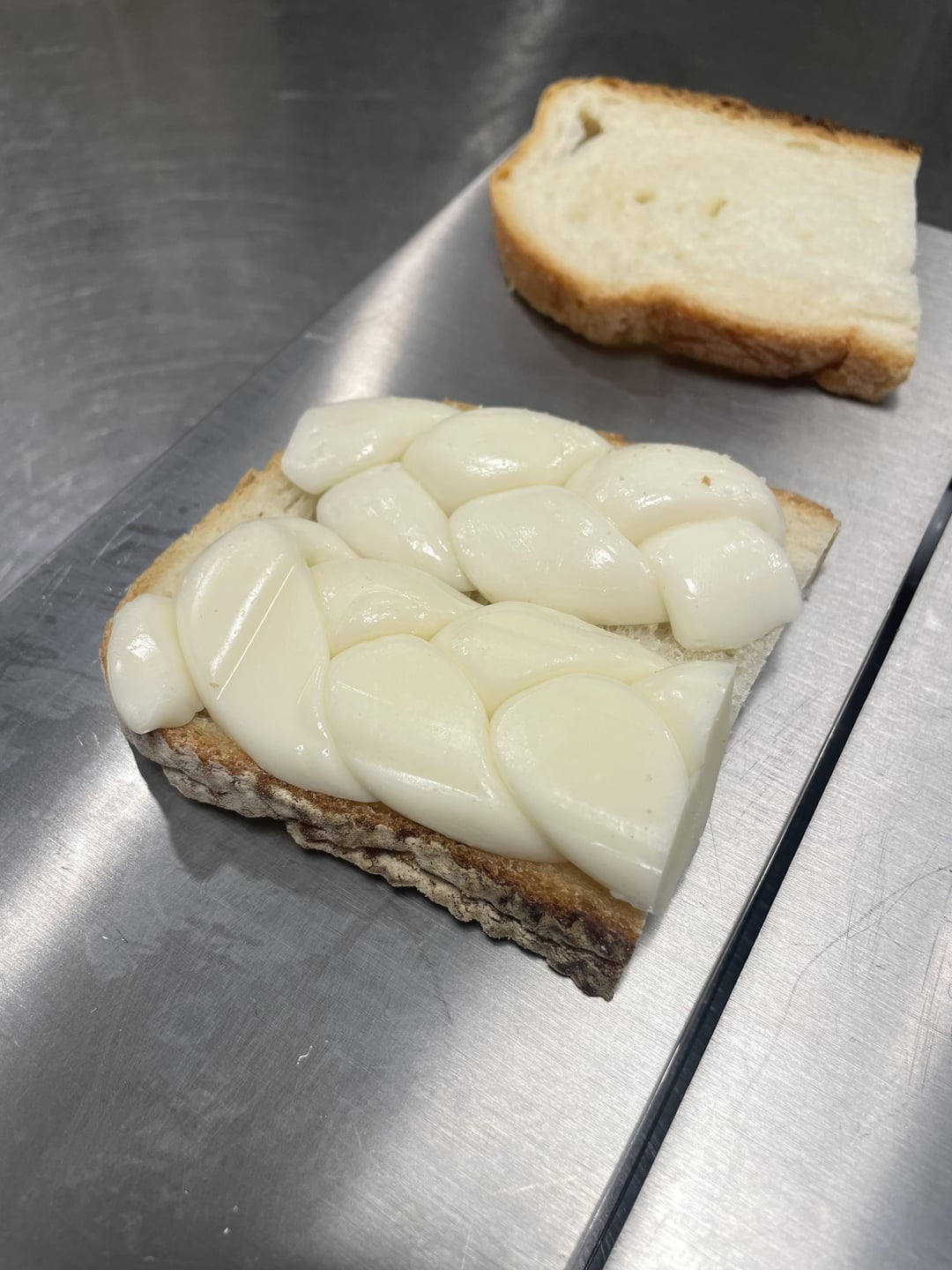 * Cheese Flavor: Tasted like milquetoast and I didn’t mean milk toast * Meltiness: Softened and had a American cheese like texture * Overall: …../10 didn’t enjoy this one at all. The most mild thing I’ve ever eaten. A memory of a grilled cheese has more flavor than this. Looked cool though.