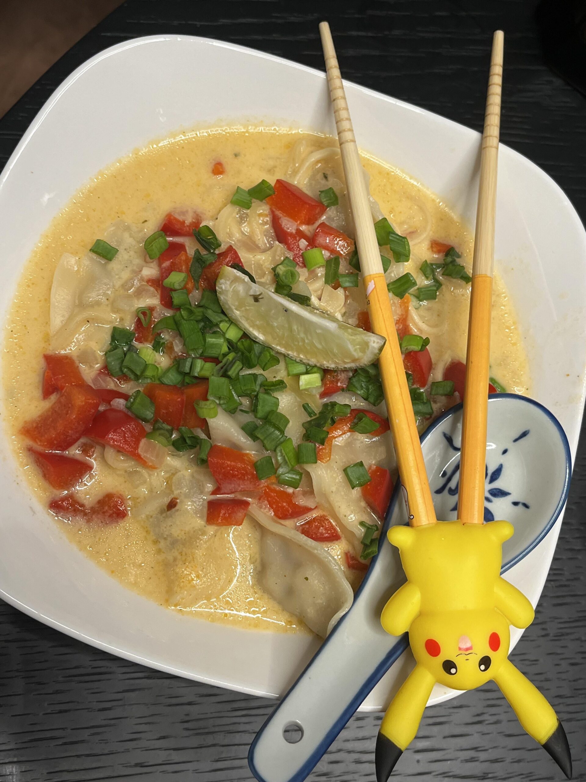 Cut your red pepper, onion and garlic into smaller pieces and throw onion and garlic in a pot with some oil. Mix until onions are see through. Then add in bell pepper and grated ginger and mix for a few minutes. After a few minutes add in your stock and let it go to boil, after you see bubbles lower the heat and add coconut milk and Tom Kha seasoning, Mix well and wait for it to boil. Then add your gyoza and boil for a few minutes before adding your egg noodles (noodles boils faster than gyoza). And there you go – you have home made Tom Kha gyoza noodle soup. Just add green onions and lime on the top.