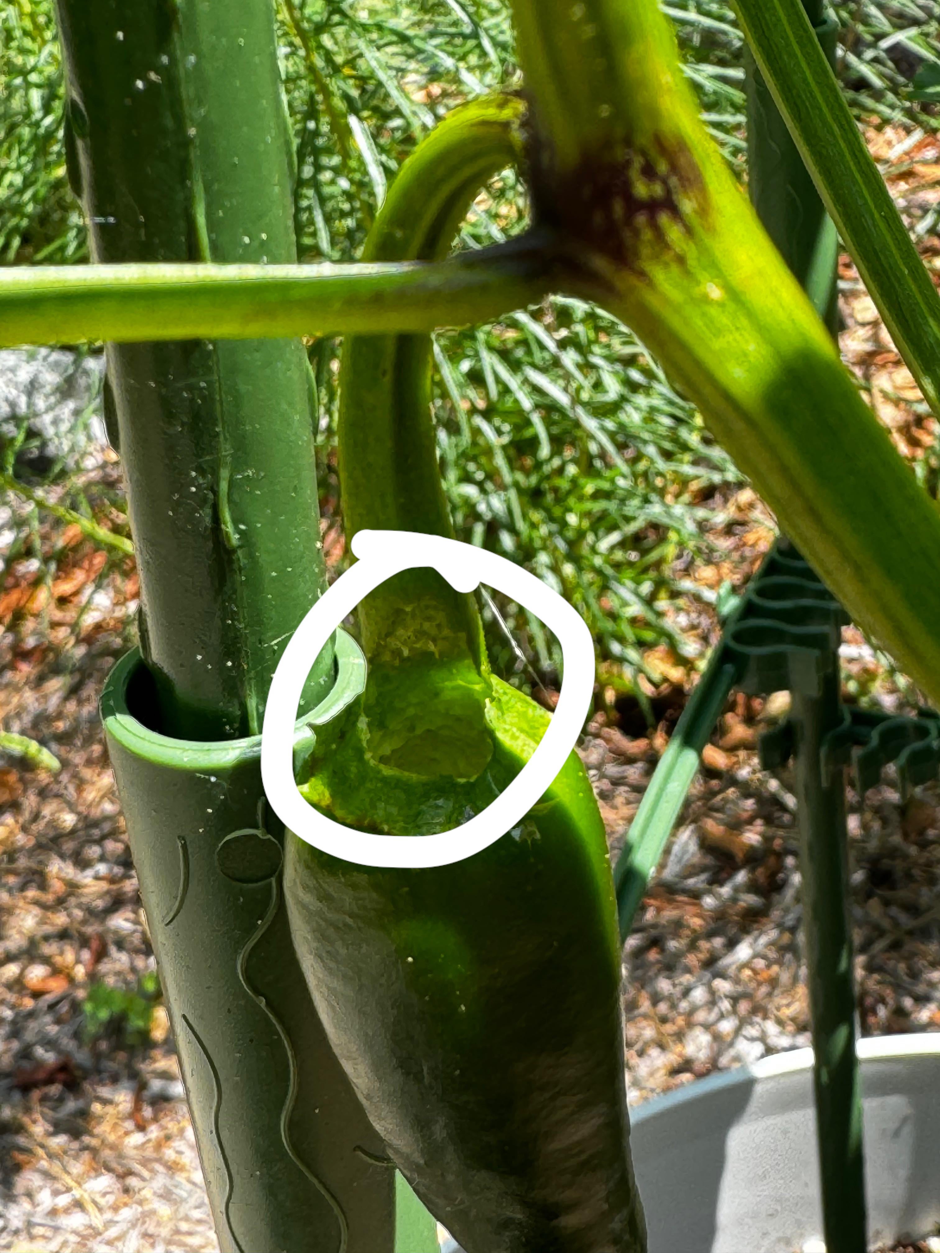 This is my first summer growing anything and my jalapeños have been doing okay. I went to go look at them like I do every morning and they all have this hole by the stem. I picked one and cut it open and I doesn’t look like there were any bugs. My other plants didn’t have this problem. Any ideas?