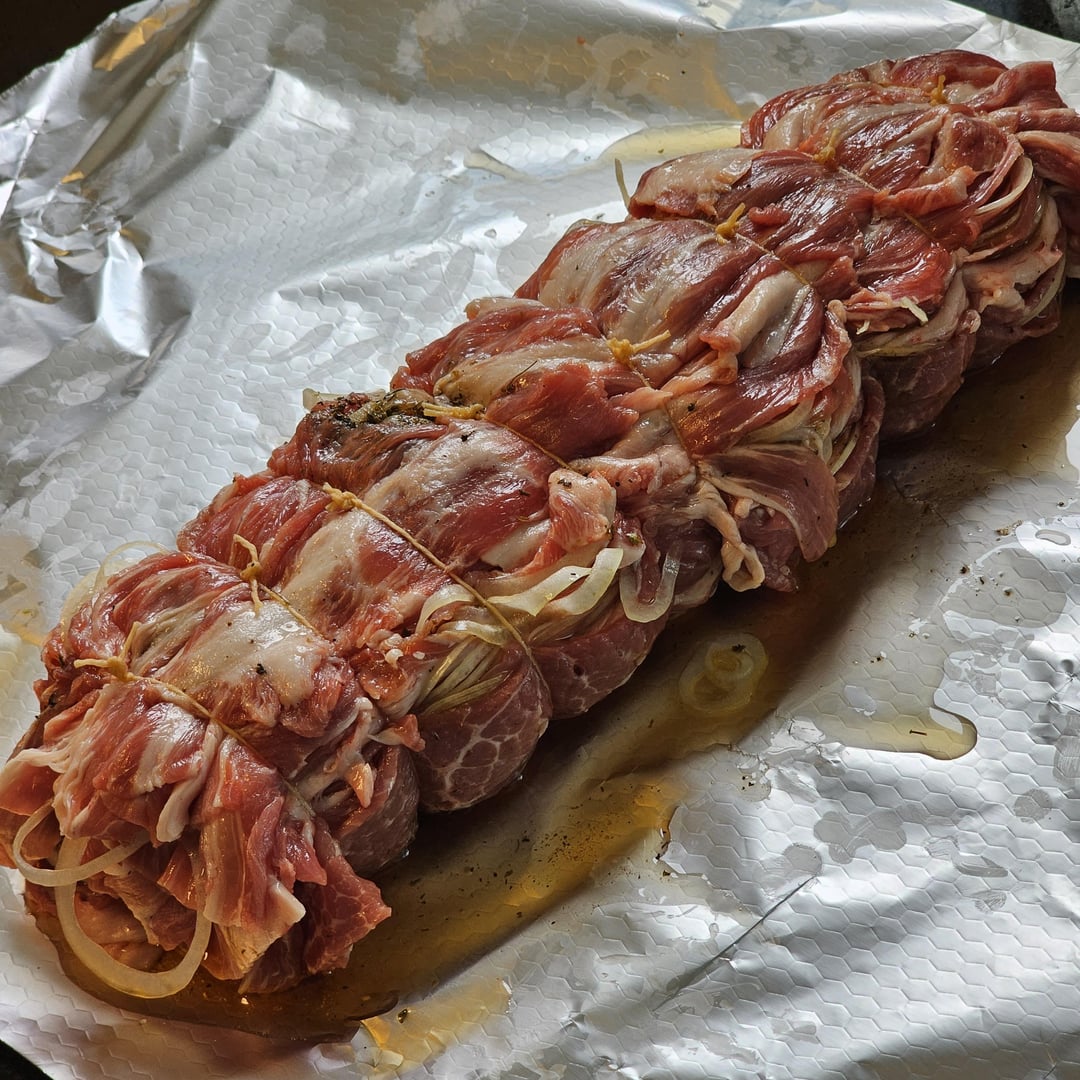 Successive layers of finely sliced pork neck and equally finely sliced onions, for tonight’s gyros-style layered roast