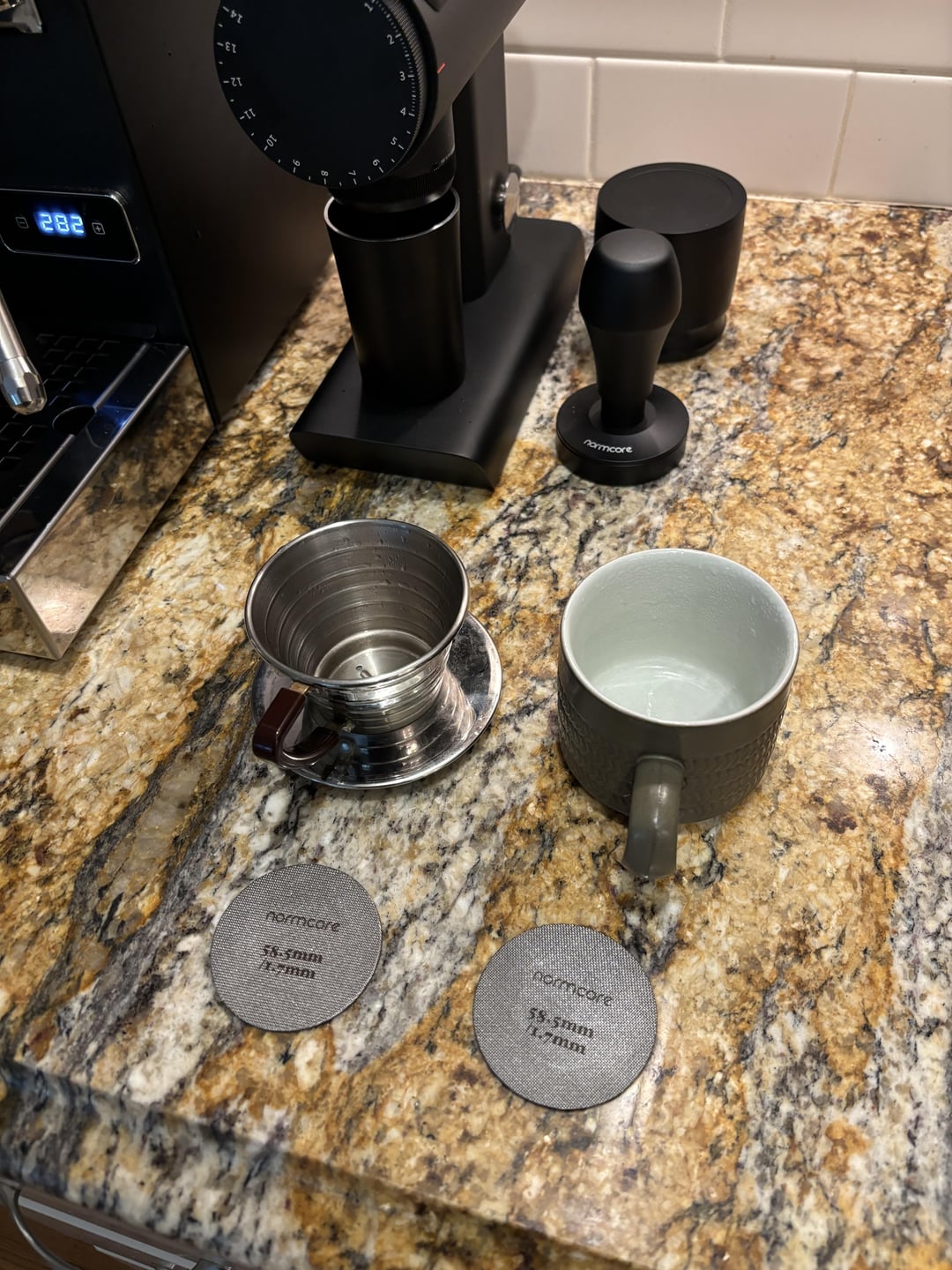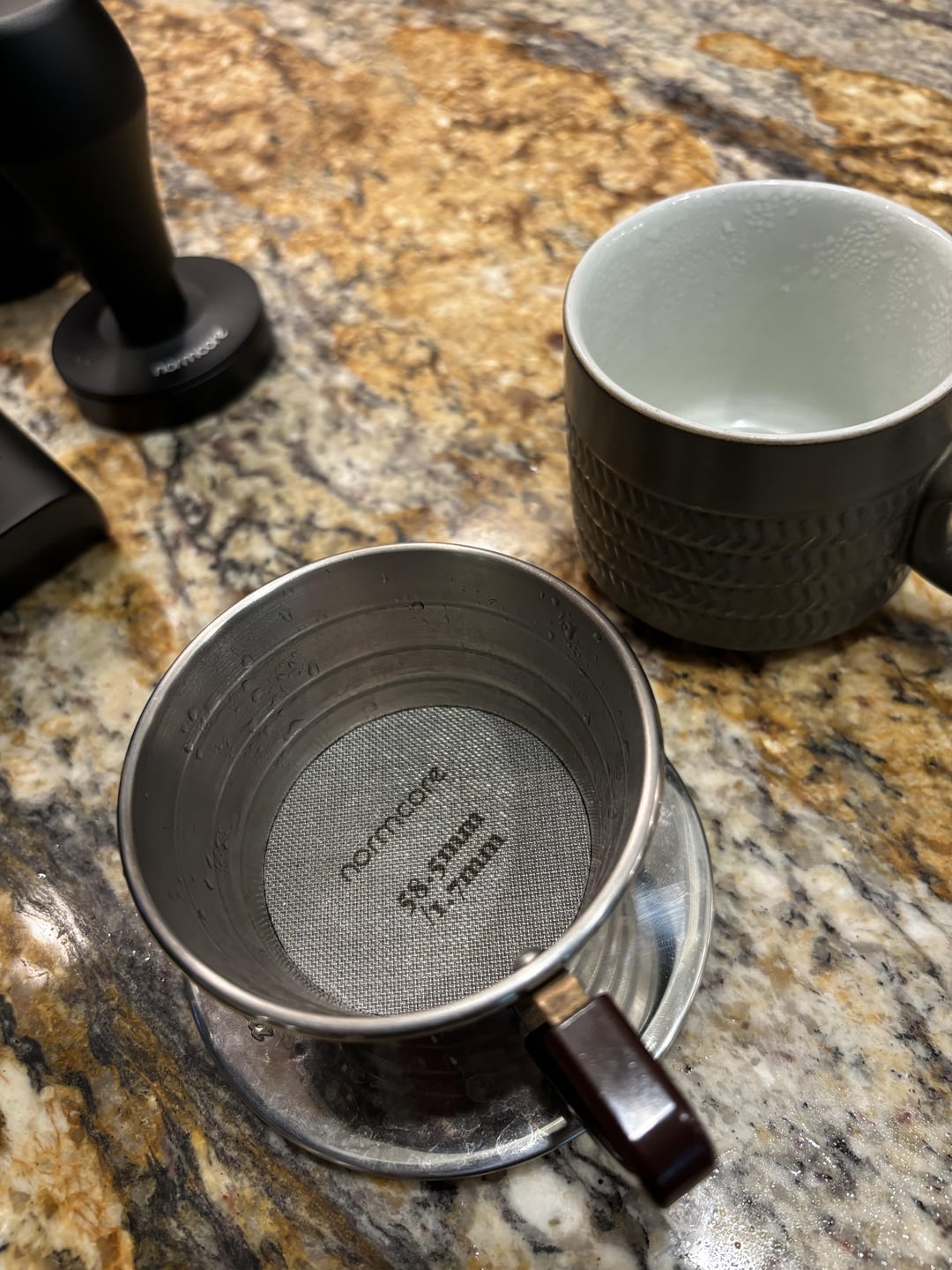 Turns out the 58.5 MM screen fits nicely inside the stepped ridges of the brewer. By placing that on a catch cup, I can blast steam through the puck and really clear it out.