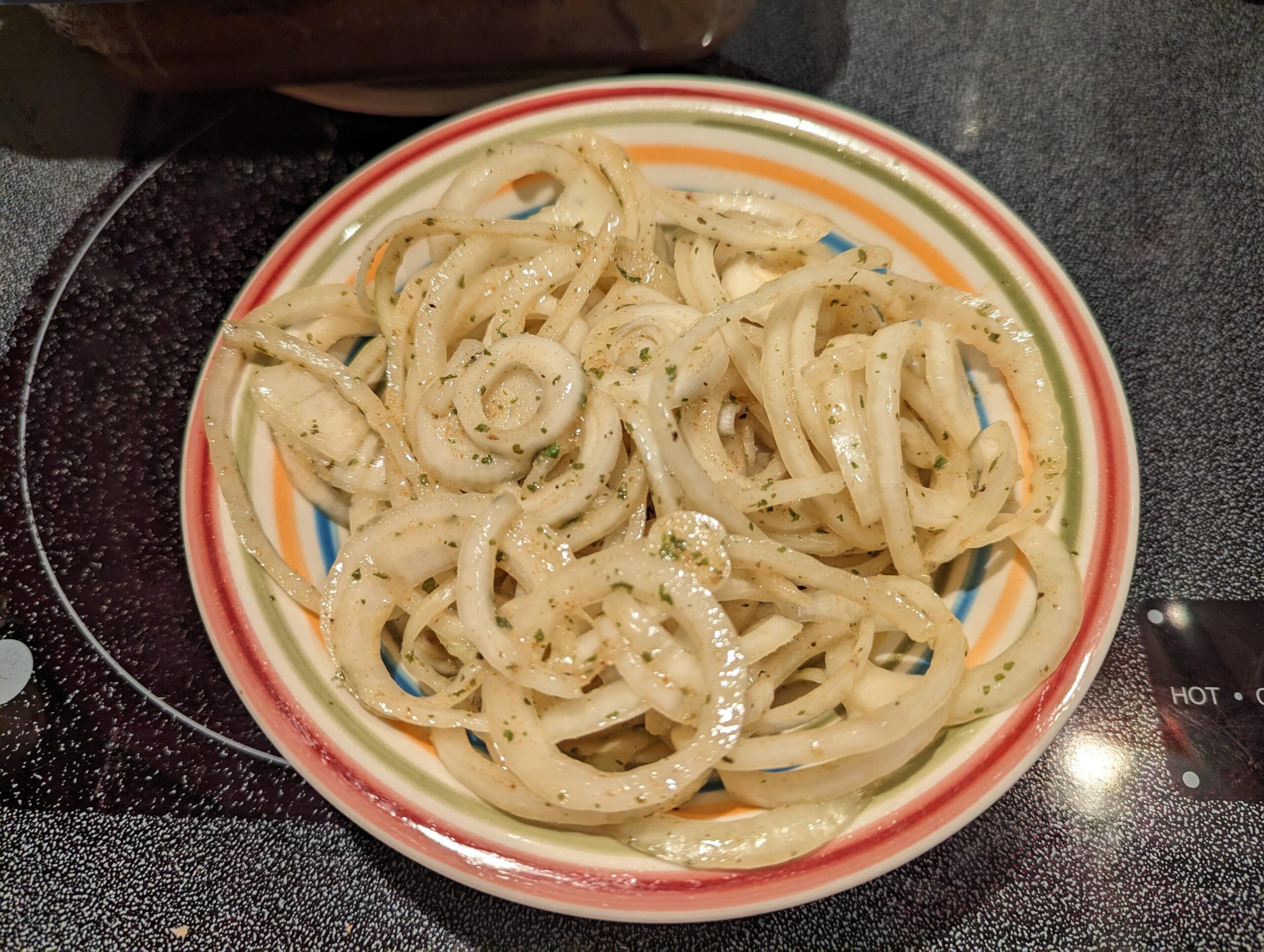 Wanted something to go with some leftover fajitas, so I made a quick salad: yellow onion, salt, pepper, lime juice, cumin, coriander powder and dried coriander leaves (fresh would have been better, but didn't have any) and some spicy oil.