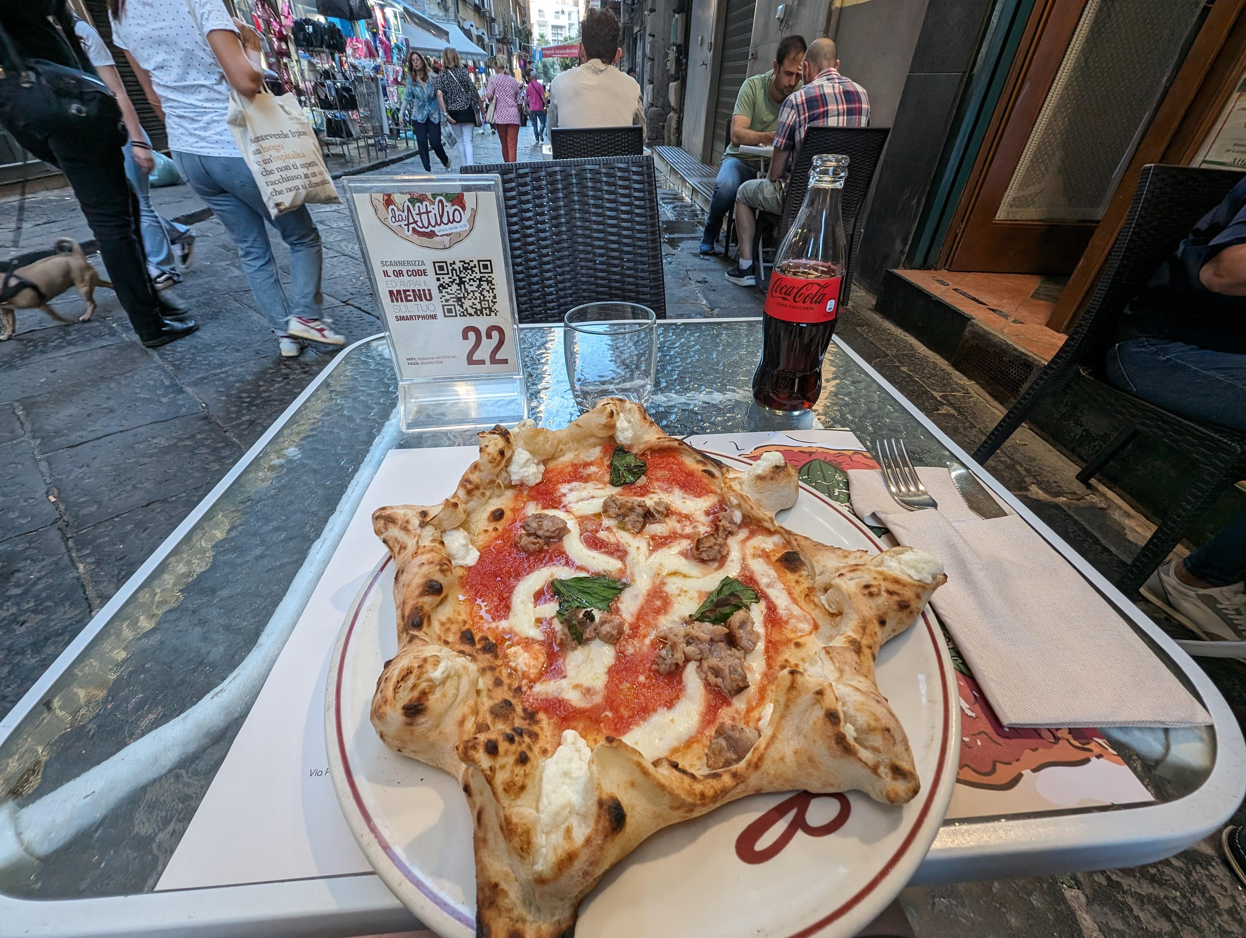 Pizzeria da Attilio. This is the pizza carnevale which is basically your traditional margherita with sausage. The crust is formed into an eight pointed star with each spoke filled with ricotta. Took two weeks in Naples and I ate here three times!