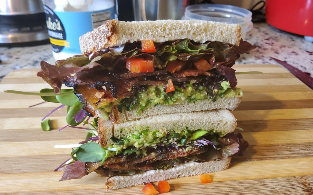 Lettuce, bacon, guac, and microgreen shoots on Beefsteak soft rye bread. I was out of tomatoes so I added diced red pepper for color.