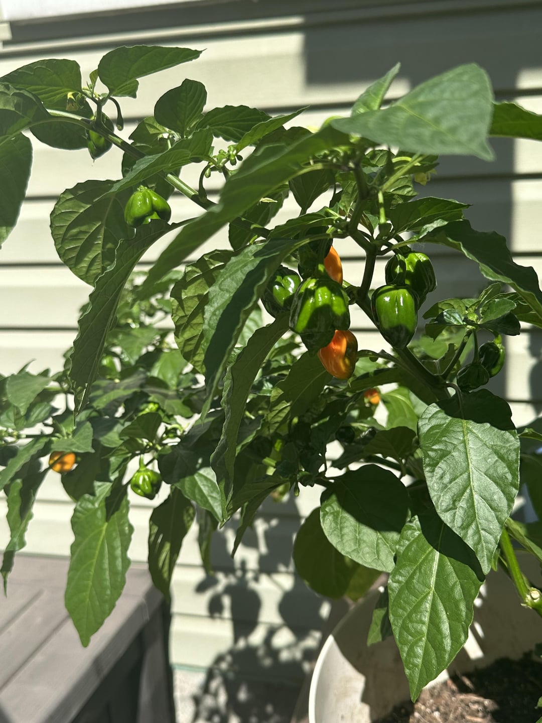 Plant 1 the peppers are a darker green were a bit more smooth, but some peppers are now turning more orange.