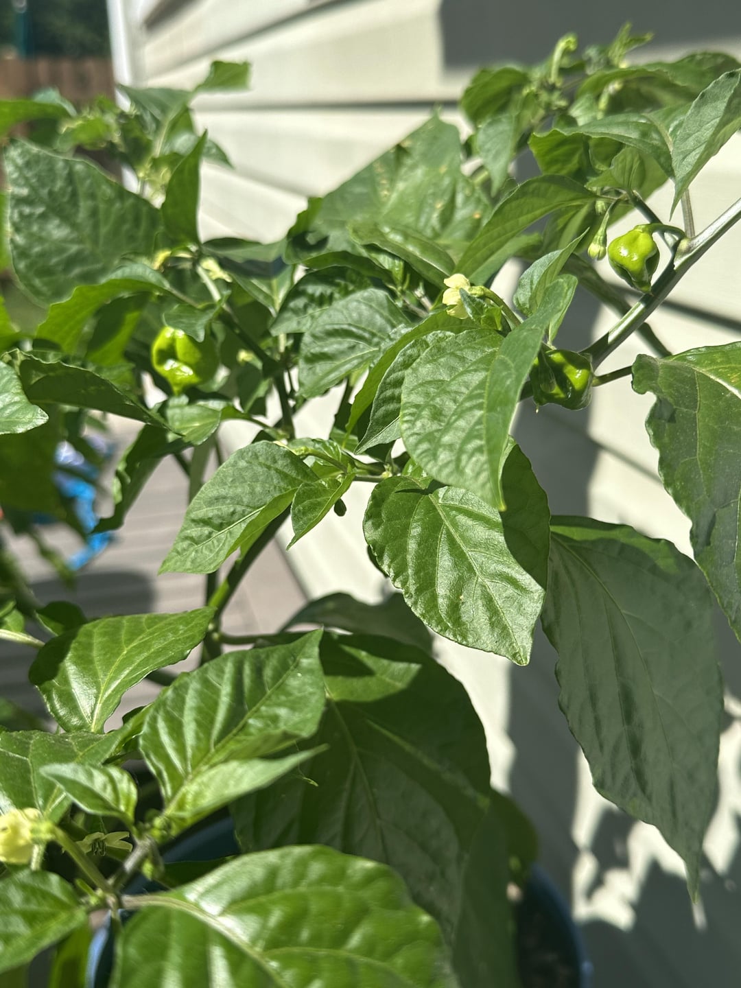 Plant 2 the peppers are a bit lighter green and seem to have more of the “reaper shape” (based on photos I have seen.)