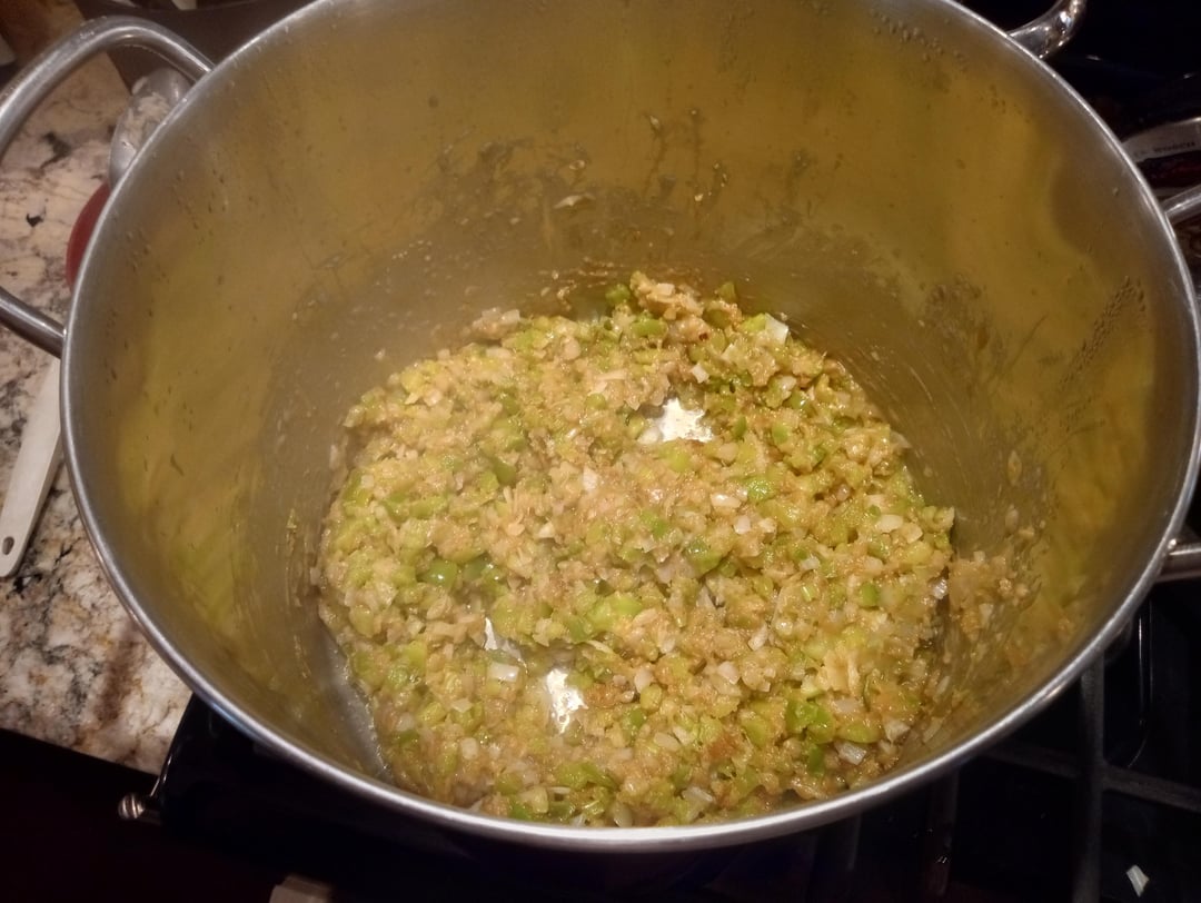 In a large soup pot with a heavy bottom melt butter over low heat. Clarify butter for about 10 minutes or until the milk solids begin to brown. Add a cup of flour and mix well with a whisk. Raise heat to medium and cook flour until it becomes the color of peanut butter. Add trinity and mix well with a large spoon. You no longer need the whisk. Cook covered for 20 minutes stirring occasionally.