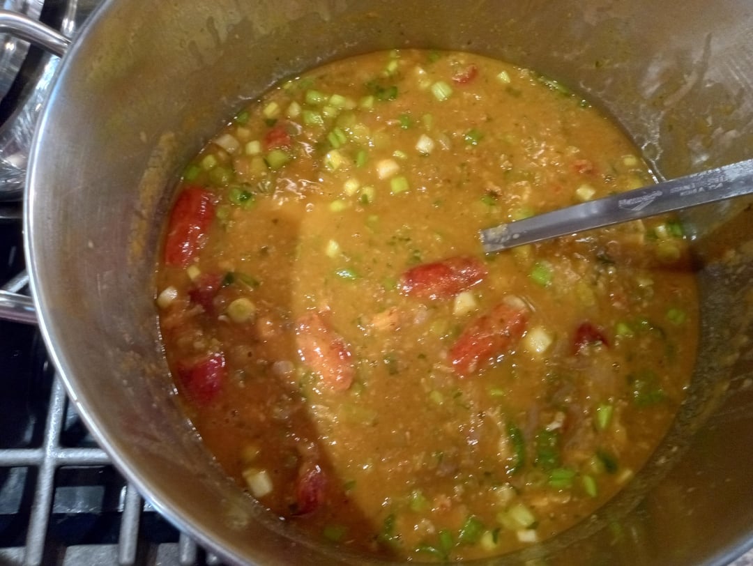 Day three brings all the hard work together. You need a stick and half of butter, 1 cup of AP flour, 4 cups of trinity (minced onions, bell peppers, and celery), 6 cloves of garlic, one 4 oz can of tomato paste (optional), 3 quarts of stock made on day one, the stuffed heads made on day two, 2 pounds of peeled Louisiana crawfish tails, 4 tablespoons chopped parsley, and a half a bunch of chopped green onions.