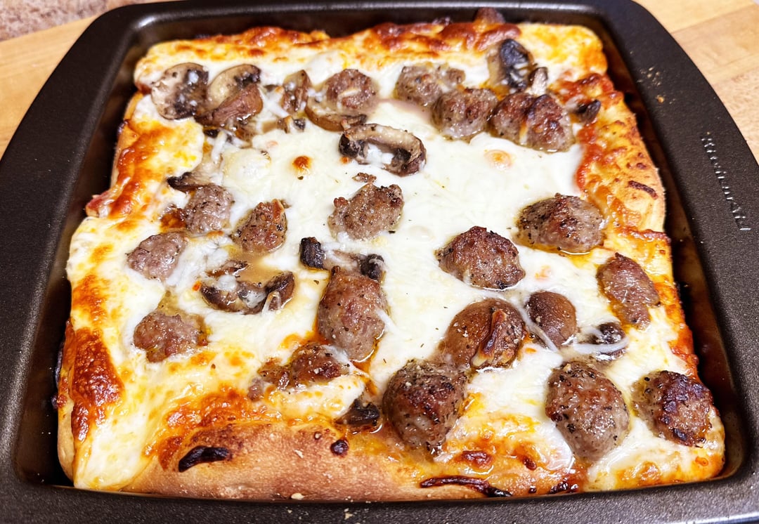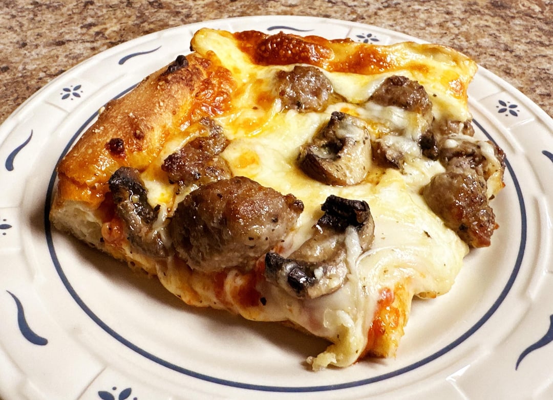 Crust, cheese, sauce, cheese, toppings. Italian sausage and mushrooms.