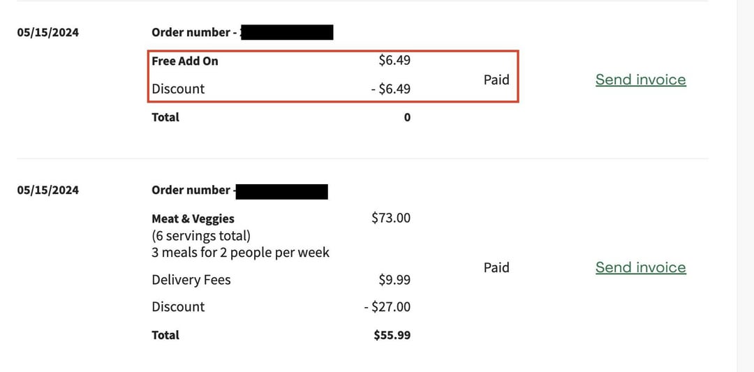 Check your order history! I just noticed extra charges from HelloFresh on my credit card bill this month, and when I checked my account, I saw they they have been charging me for a “Free” Add On for weeks now instead of discounting it like in the past.