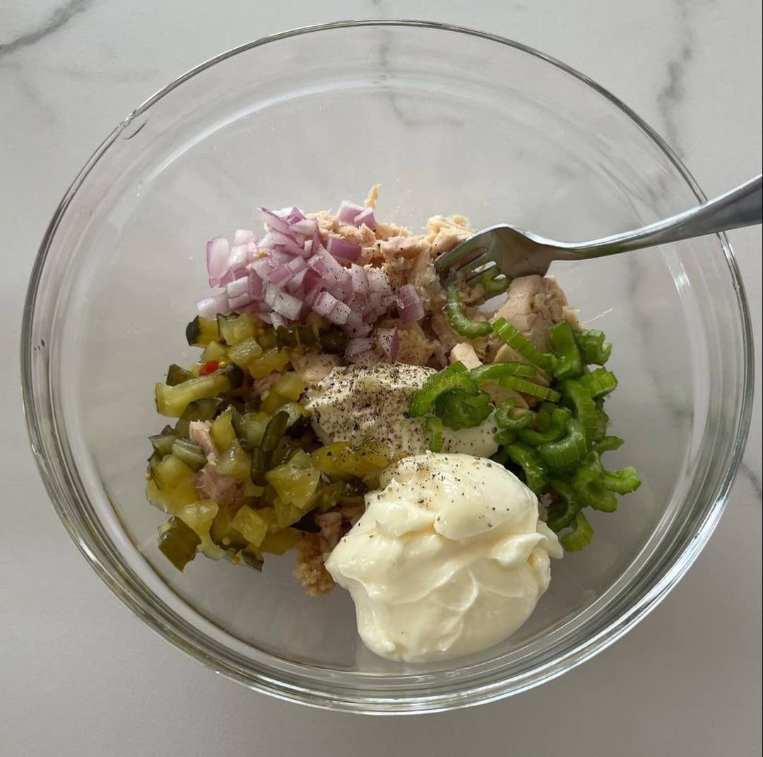 Is that albacore tuna? I always use solid white albacore tuna, add mayo (kewpie is my favourite), dill pickle relish, celery and green onion and a little salt and pepper. I love tuna salad! Edit: I see the last picture now, it does look like albacore and very similar to my recipe, dill or sweet pickles?