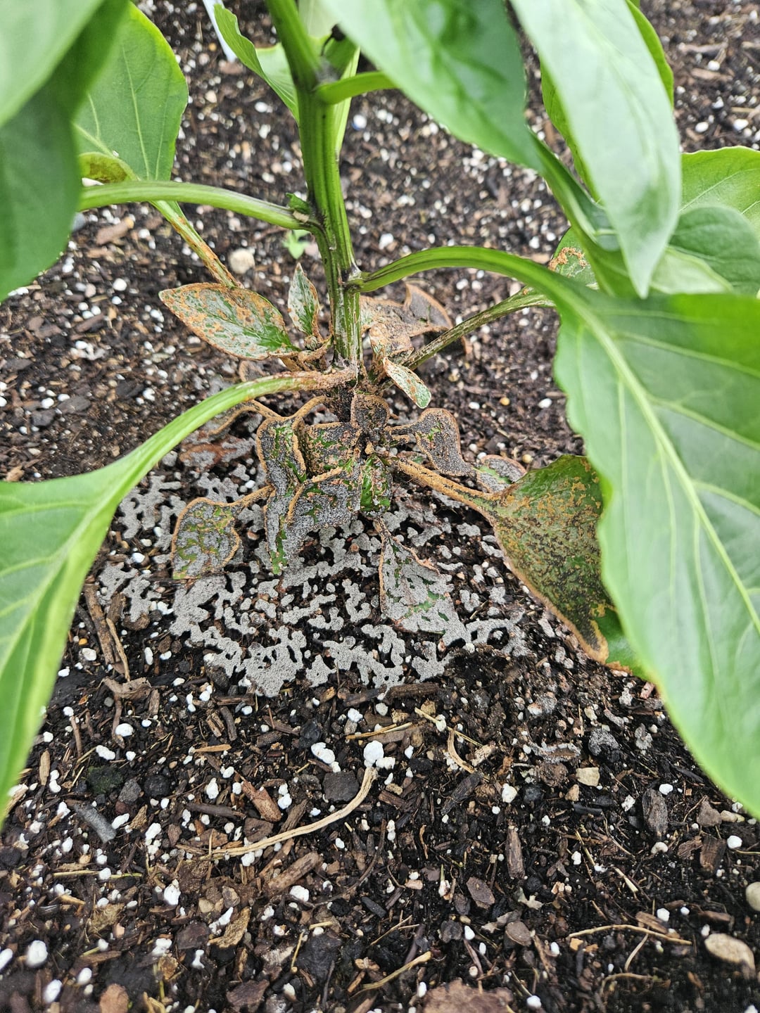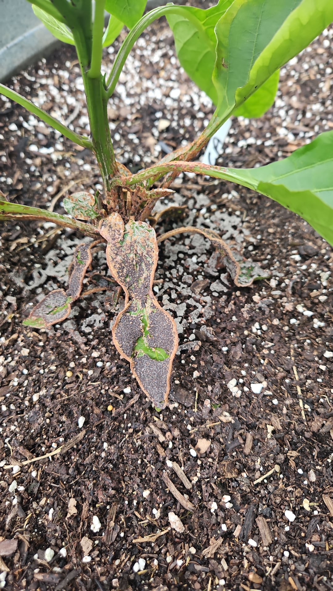 Maybe spray a H2o2 solution at the base after pulling all the funky leaves and scraping some of that fungus off the soil? That’s new to me