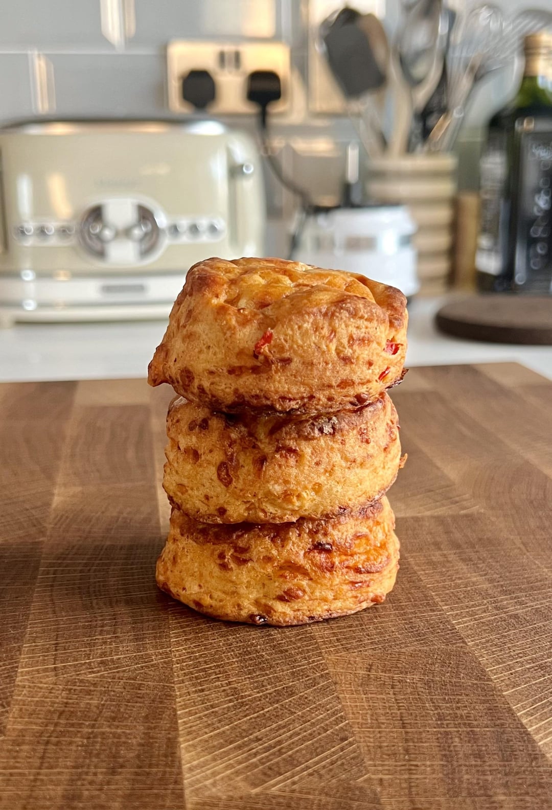 Method 1. Combine flour and butter with food processor. 2. Move mixture to a bowl and add cheese, butter milk and seasonings. 3. Rollout to a 2-3 cm thickness, folding over a few times. 4. Cut out biscuits using a cookie cutter. 5. Brush the top with more butter milk before baking in an oven at 220 celcius.