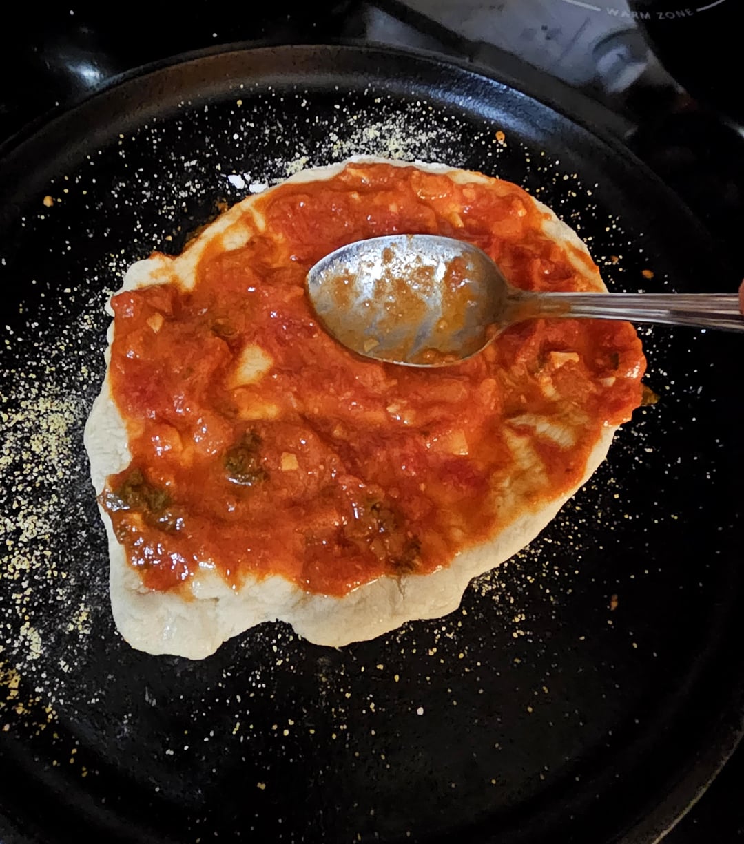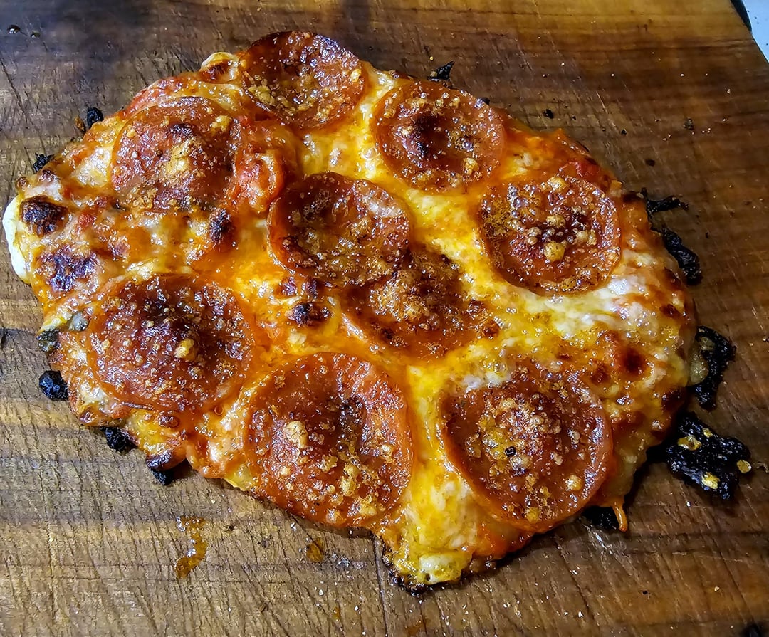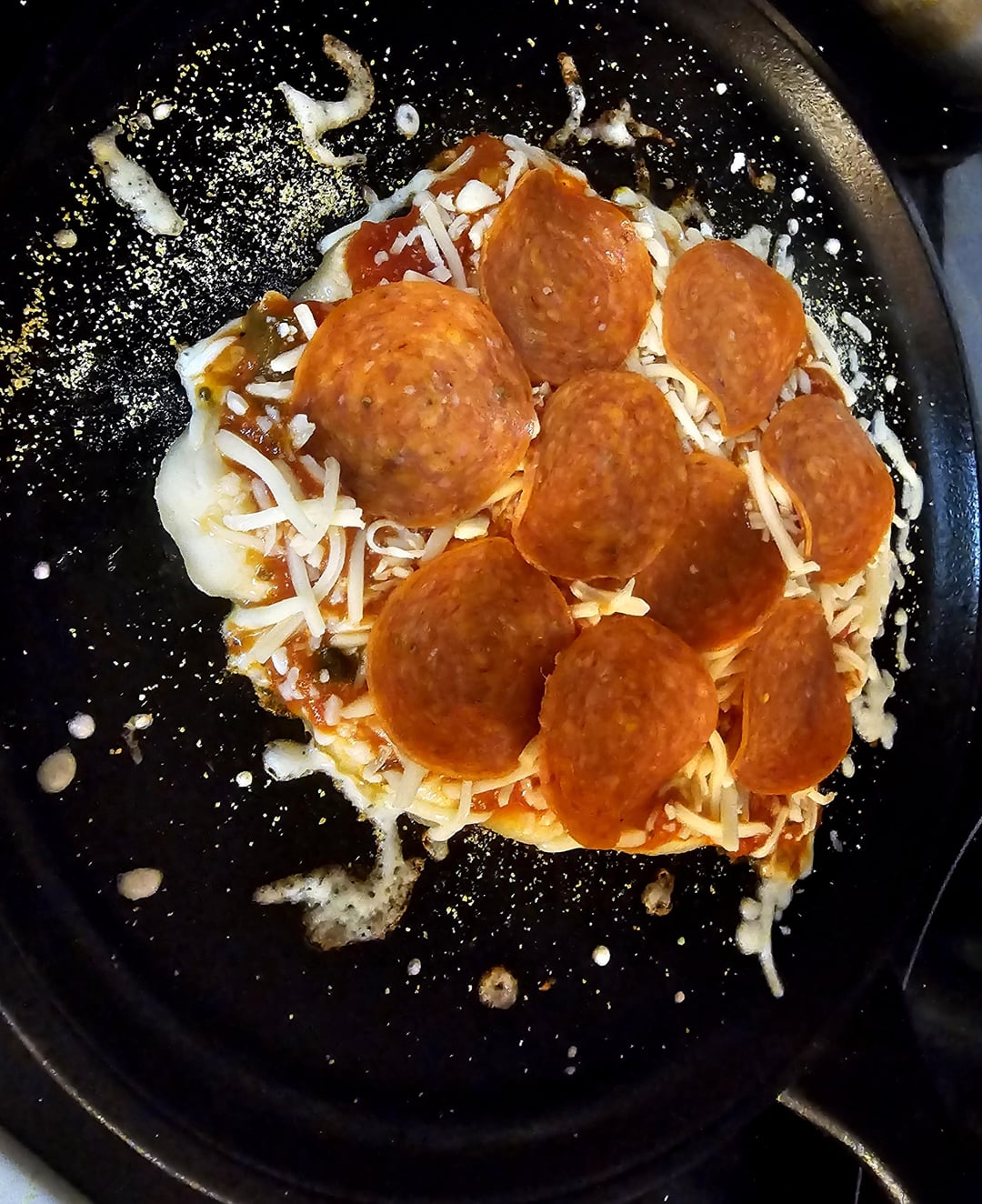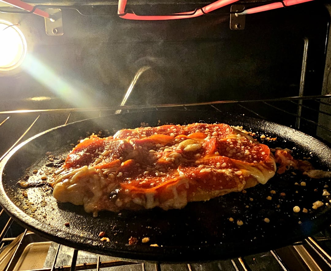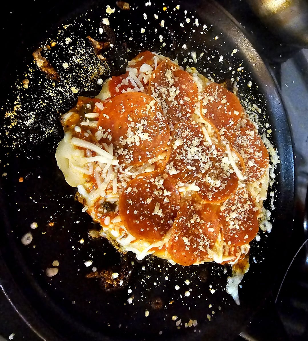 Stretch store bought pizza dough to size, assemble on skillet over medium-high heat while broiler warms up, dough, sauce, mozzarella, pepperoni, parmesan, and place under broiler until cheese melts. If you like the crust more done leave it on the burner longer, less done use a lower temp while assembling.