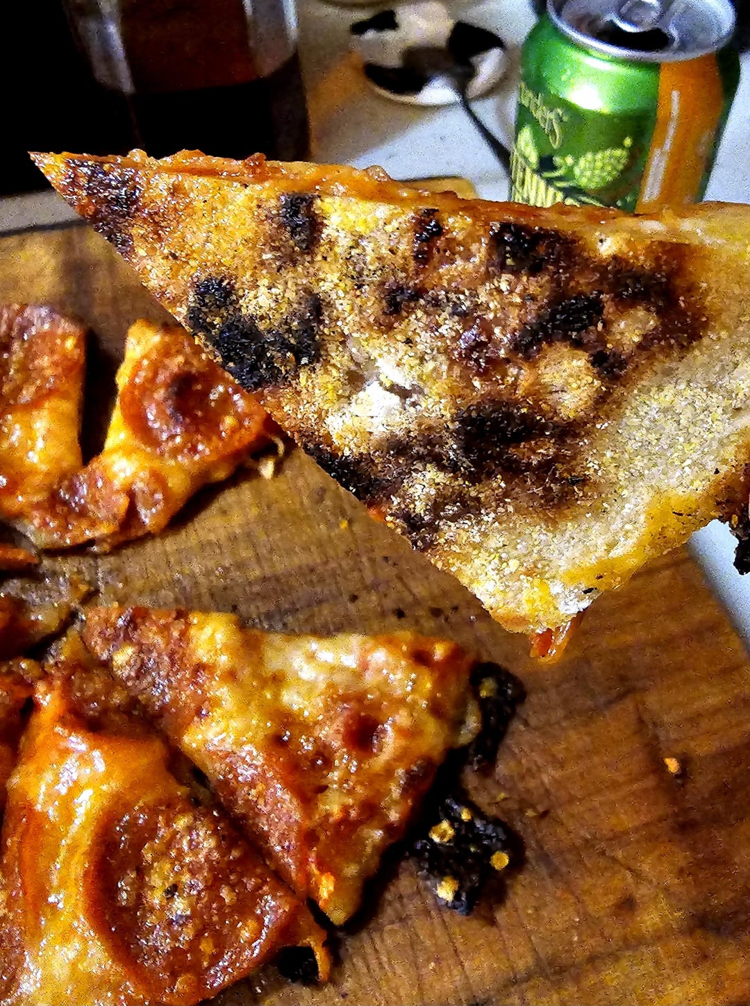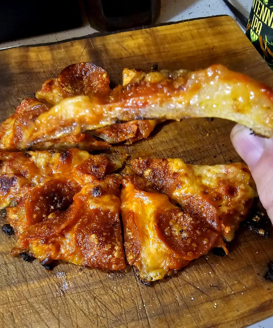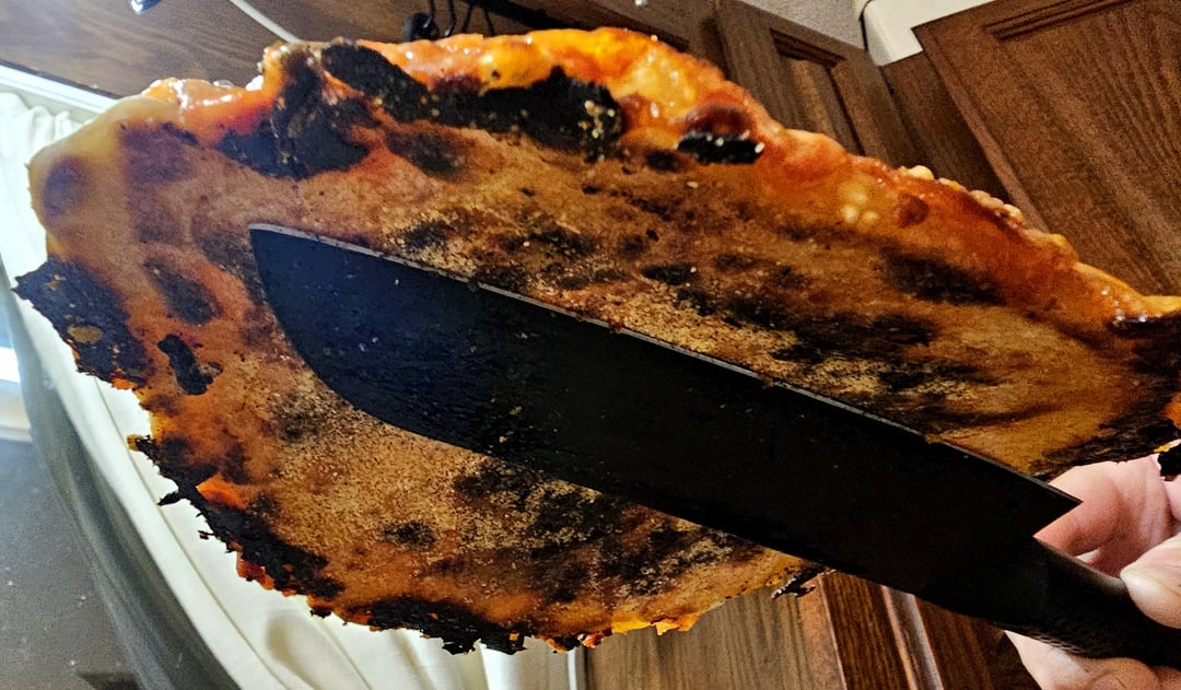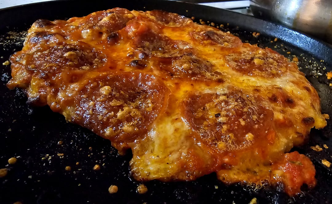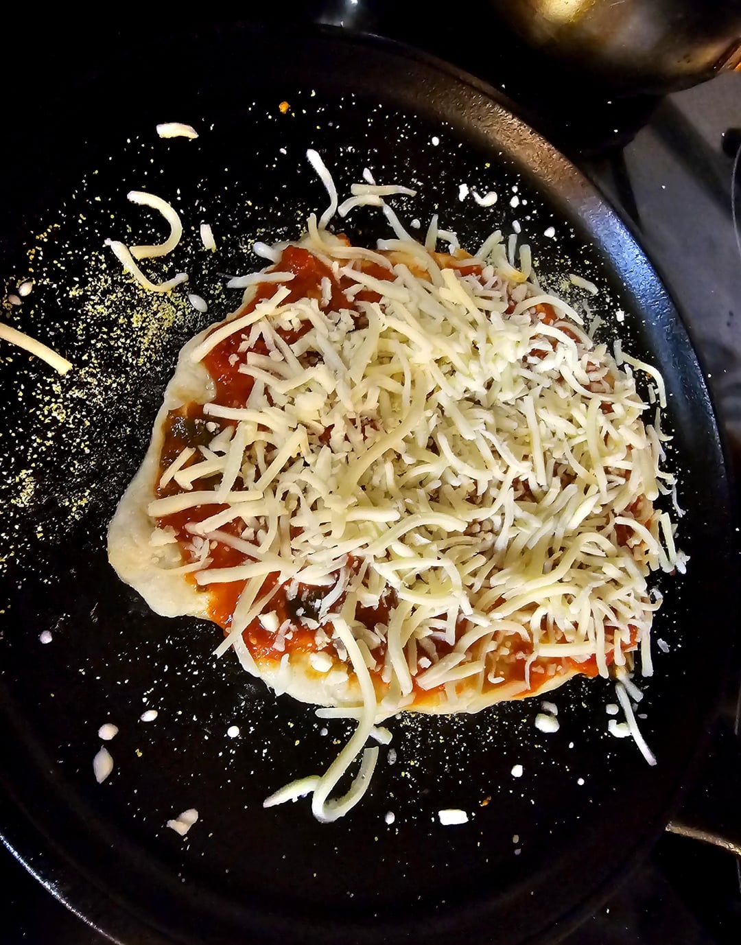 Stretch store bought pizza dough to size, assemble on skillet over medium-high heat while broiler warms up, dough, sauce, mozzarella, pepperoni, parmesan, and place under broiler until cheese melts. If you like the crust more done leave it on the burner longer, less done use a lower temp while assembling.