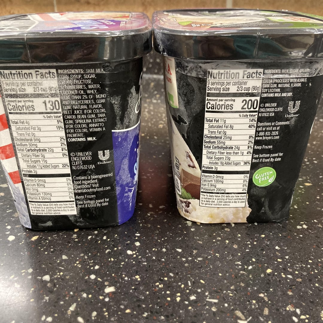 - Technical details: “Frozen dairy desert.” 130 calories and 81 grams per 2/3 cup.