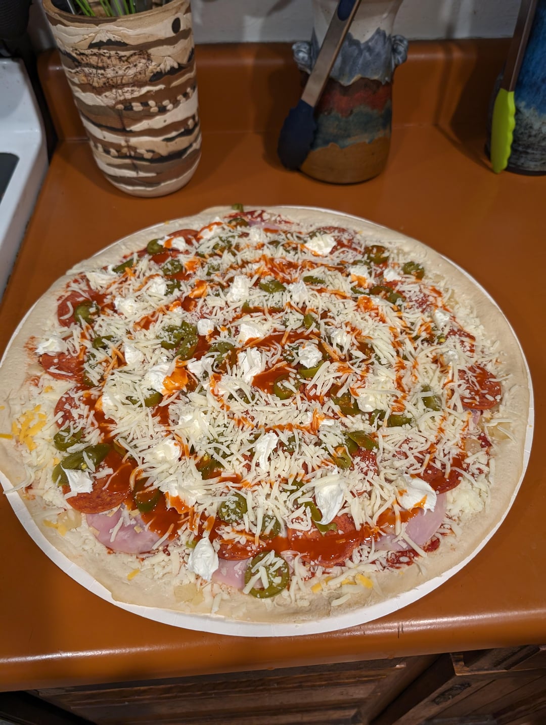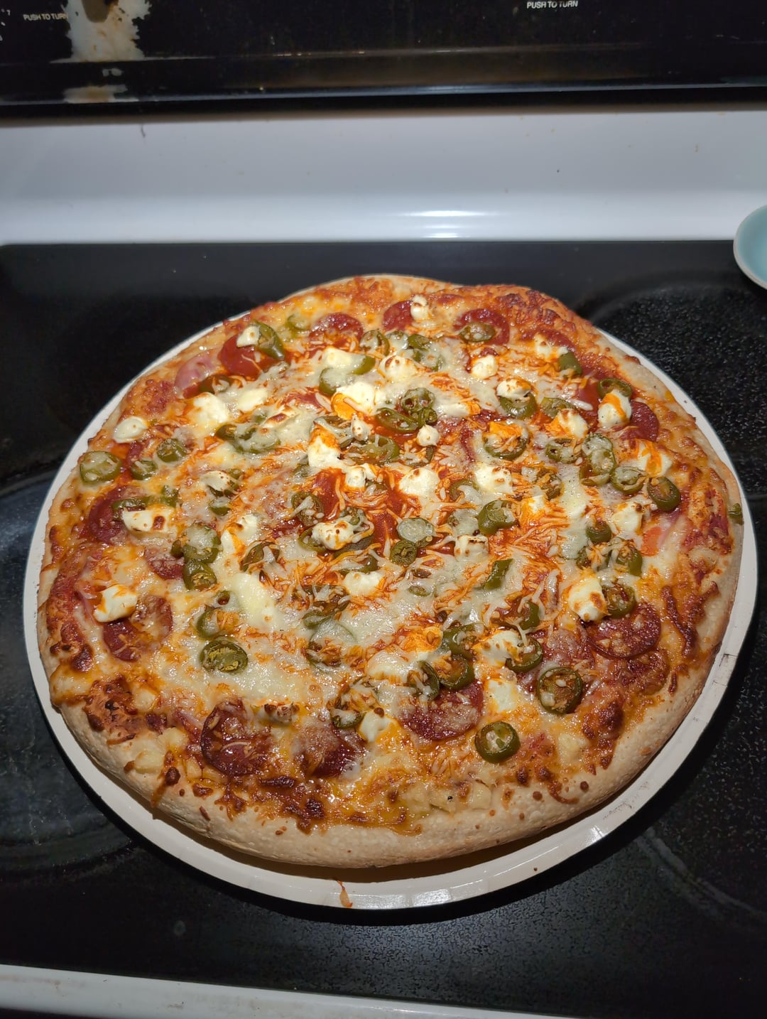 I ordered a Hawaiian pizza from Papa Murphy's then I added jalapenos, cream cheese, pepperoni, buffalo sauce and some more cheese. It was delicious, the sweet and savory with a kick of spice was awesome. Probably a crime somewhere