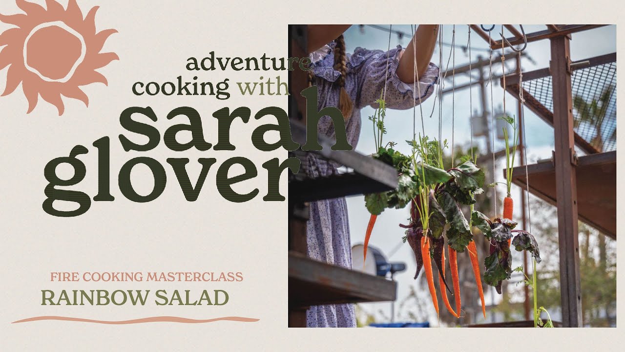 [Music] hi I’m Chef Sarah Glover I read an adventure cookbook especially for you and your kids and this book takes you on an incredible journey and it’s all about adventuring and cooking with your kids in The Great Outdoors I want to show you one of my favorite recipes and this is the fire salad it is really easy to make and I cook it on a regular basis what we’re going to be doing is basically hanging vegetables on the fire so I’ve got some beetroot here you want to make sure that when you’re um selecting your vegetables for this that you keep all of the leaves um and the stalks on your veggies because we need this to be able to hang them on the fire so what you guys are going to need is some butcher twine you want to make sure that your twine is not um covered in any form of plastic coating because that’s just going to melt over the fire um so we’re going to cut up some bits of string about about so big that’s about a meter maybe a bit more and all you’re going to do is get your vegetable and you’re going to tie off your string around the um stalk of the veggie just be mindful that you want to make sure it gets nice and tight because as this Cooks on the fire and the heat basically absorbs like takes the moisture out of what you’re cooking it’s going to shrink a little bit so this is looking pretty good to me we want to make sure that our vegetables like facing down towards the fire um and like I said just make sure it’s tied off nice and tight if your kids are helping maybe just um double check their knots on this this is a little fun exercise that you can do with your kids and teach them how to tie or knot um I’ve also got some carrots here again make sure the stalks are kept on them uh when you’re at the farmers’s market or at your local Farm Stand make sure you ask what’s in season other vegetables that could be really good to cook on the fire could include things like um you can do some spring onions you could also do some fennel bulbs any kind of root vegetable that grows under the ground is really great for this recipe also um brussel sprouts you can sometimes get them on the big stalks you could hang them over the fire and you’re probably thinking Sarah why am I going to be hanging my vegetables on the fire to cook them and the reason being is that it’s going to give you a really lovely Smoky flavor to your salad it’s also fun it looks really pretty um but the radiant heat is going to cook your vegetables and um you’ll be surprised at how delicious these turn out and they still stay quite alente and that means that they have a little bit of a bite to them so they’re not going to go too soggy if you don’t overcook them which we do not want to overcook them because this is going to be in a salad so when you’ve tied up all your vegetables what you’re wanting to do is have have a little pot of extra virgin olive oil and we’re just going to cover our veggie in some oil I just do it in a pot because um it’s easier you’re not going to waste too much extra virgin olive oil again this is fun to do with your kids they can get their hands dirty kids love to get messy um and then we’re going to get some sea salt and I’m just going to give this a little bit of a Sprinkle this is going to be flavor for our veggies now you can just hang them straight like this over our fire behind us by just tying it around um whatever your apparatus is another really handy um little thing to have in your kitchen in your outdoor fire tool kit are these S hooks and they’re butcher hooks so this is what a lot of butchers use to hang all of their meat um I have so many of them and they’re really really handy to have um like I said in your outdoor fire tool kit the idea is the root vegetables tend to be more starchy so they cook really well over the fire and then all we’re going to do at the top here is we’re just going to do a little like Loop so we just Loop it like so and then we’re just going to wrap it around our finger and create another loop and then we come up in and under and just pull it through and that way we’ve got a little hanging Hook and the beauty of this is that it just makes it easier to move it around the fire as it starts to cook down because obviously the most intense heat is going to be in through the center of our fire here so our beet treats are going to take a little longer to cook over our carrots so we might need to move things around if you don’t have um like a incredible setup like this in your backyard like most of you probably don’t um you can also use a tripod the other fun thing to do is even you know um with your kids go foraging for some sticks um and build a tripod yourself it’s really not that hard and you’ll find your kids will love this little exercise and the fun thing about doing it this way too with your kids is they’re going to want to try it because they’re going to be curious to know what this actually tastes like so perhaps this is a good way to get your kids to eat some vegetables now I’ve had my fire burning down for probably 2 to 3 hours now you only really need to have it going for an hour you just don’t want to be cooking with like a very strong flame you want it to be a little more um like of a radiant heat now don’t throw away this extra virgin olive oil either because you can use this for your salad dressing all right so this is going to take about an hour for this to cook like this um a thing to just be mindful of is when you’re trying to like figure out how hot your fire is if you hold your hand above the fire and you feel like you’re burning or you’re cooking yourself you know your Vegeta’s going to cook that’s how you always tell is just use your hands things to also be mindful of if it’s a really windy day it’s going to blow the heat out from underneath whatever you’re cooking and it will take a little bit longer um so always be mindful that if it wa