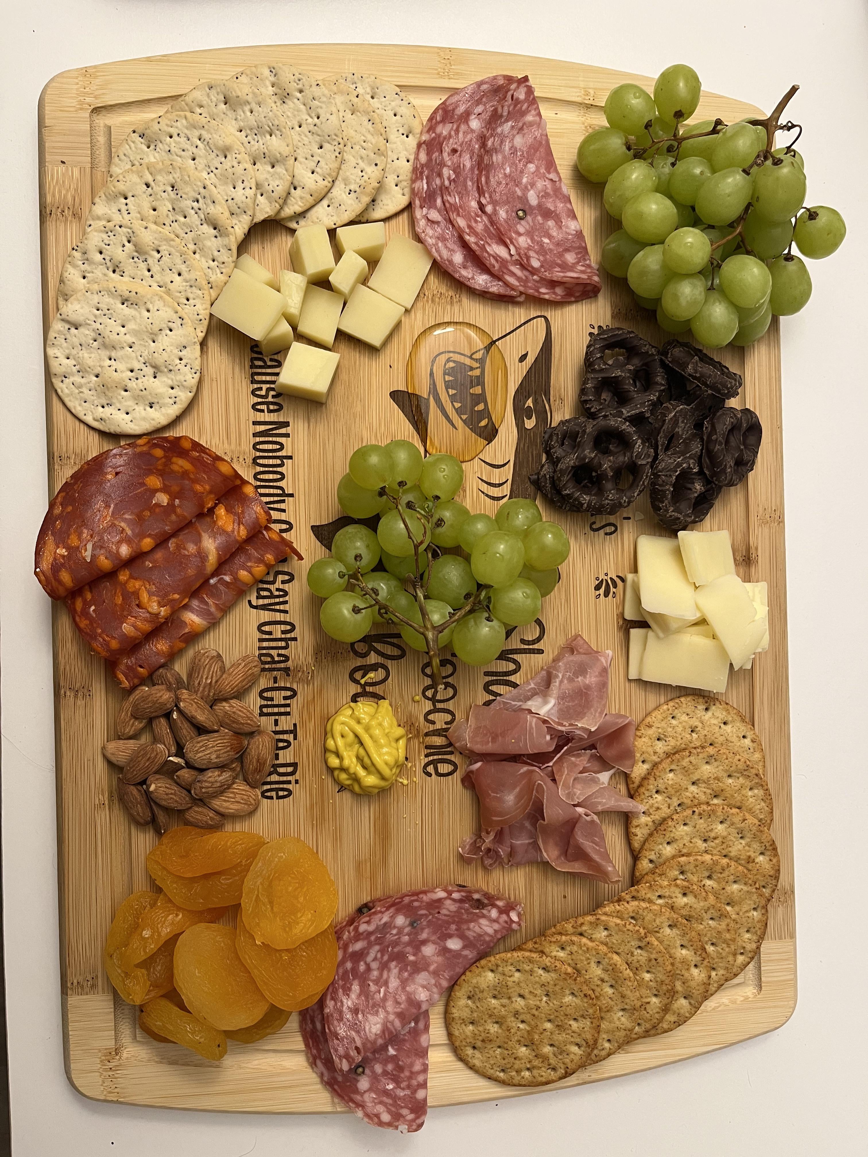 Personally, I like to put honey or any sauces in little ramekins to protect the wood of the board. That said, I think you could still incorporate the shark, perhaps by putting half a grape in its mouth to look like he had a little nosh?