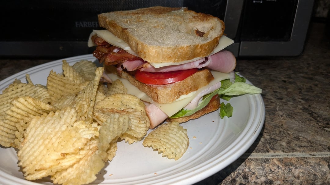 Ham, turkey, bacon,Swiss cheese, butter lettuce, tomato and red onion on cheese bread 🤤