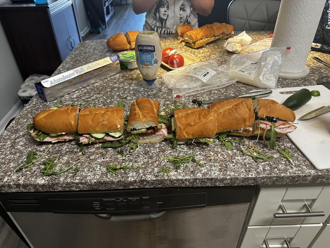 Turkey, ham, capocollo, coopers sharp, arugula, tomato, cucumber, black olives, mayo, French bread.