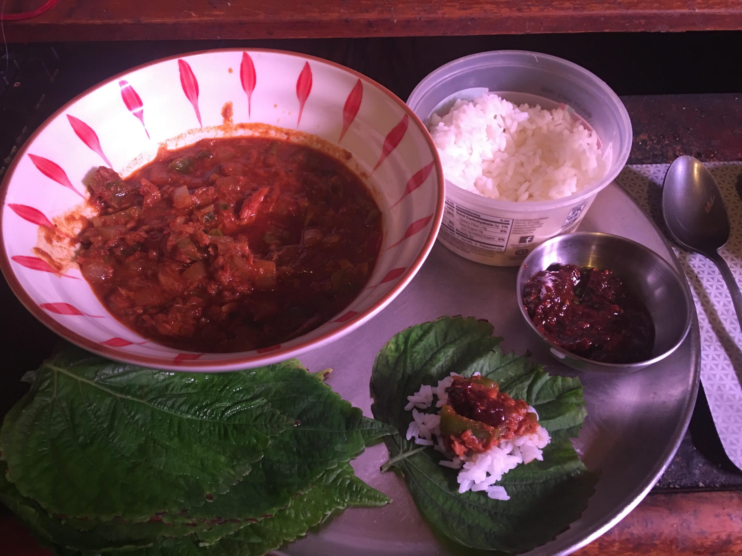 RealmanPwns1 2 years ago I made Chamchi Jjigae!IngredientsServes 41 pound of canned tuna (2 large Korean canned tuna tins, or 4 regular-sized tins)1 large onion (about 10 ounces), cut into chunks2 large long hot green chili peppers (or 4 to 5 normal-sized green chili peppers), sliced2 to 3 tablespoons gochujang (Korean hot pepper paste)2 tablespoons gochu-garu (Korean hot pepper flakes)1 tablespoon soy sauce4 garlic cloves, minced2 green onions, choppedlettuceapple ssamjangDirectionsSpread the onion on the bottom of a shallow pan.Add half of the sliced green chili peppers over top.Add the tuna, hot pepper paste, hot pepper flakes, soy sauce, and 1½ cup of water.Cover the lid and cook for 10 minutes over medium high heat.Open and stir it with a wooden spoon to mix it up.Stir in the garlic, green onion, and the rest of the chopped green chili pepper.Let it cook another 3 to 5 minutes uncovered, to thicken the stew.Remove from the heat and serve right away with rice, lettuce, and ssamjang.