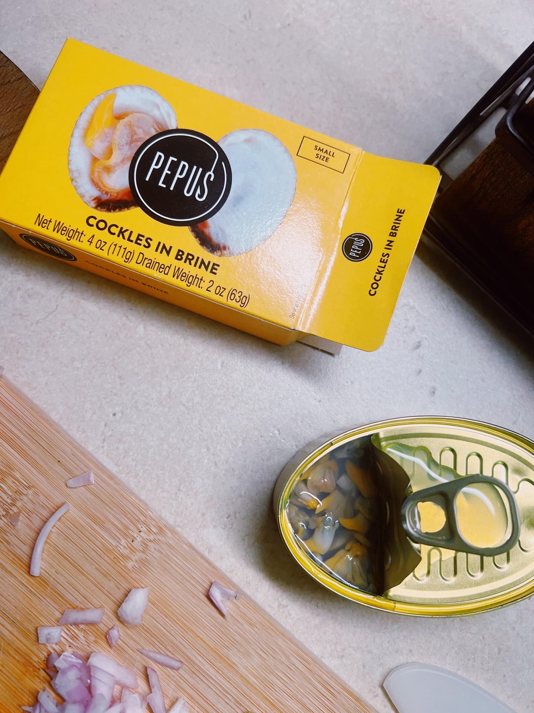 Just made this pasta up with what I happened to have: chopped up bacon, shallots, mushrooms, and added frozen peas. Mixed in the cockles at the very end. Used lemon oil and this awesome vinegar I have.