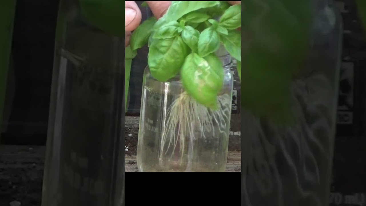 see how that green Basil’s doing come on let’s go up to the greenhouse and check it out but before we get too far down that road remember I told you it’ only be a few days and these would root so we’re going to go ahead and get these in containers also that’s just how fast your basil goes just take one or two of these out of here just look at the roots on that I’ve got a little soil preset in here just going to set this down in here back will