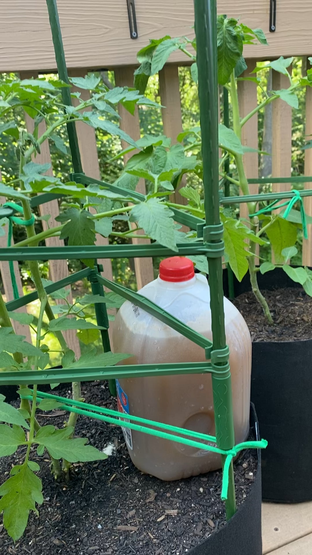 To anyone that saw the last ghetto drip irrigation video I posted. I took note of what everyone had recommended me to do instead, and I did. The cap with a hole slowed down the drip drastically. I used a gallon jug this time. It’s 30 min in and the jug is still 3/4 full.
