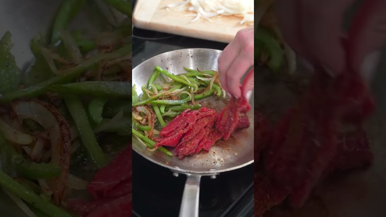 Philly cheesesteak, but make it a burrito! Start with your favorite cut of Omaha Steaks and slice it thin. It helps if the meat is slightly frozen when you’re cutting it thin. Season your sliced steak, green pepper, and onions with Omaha Steaks seasoning.