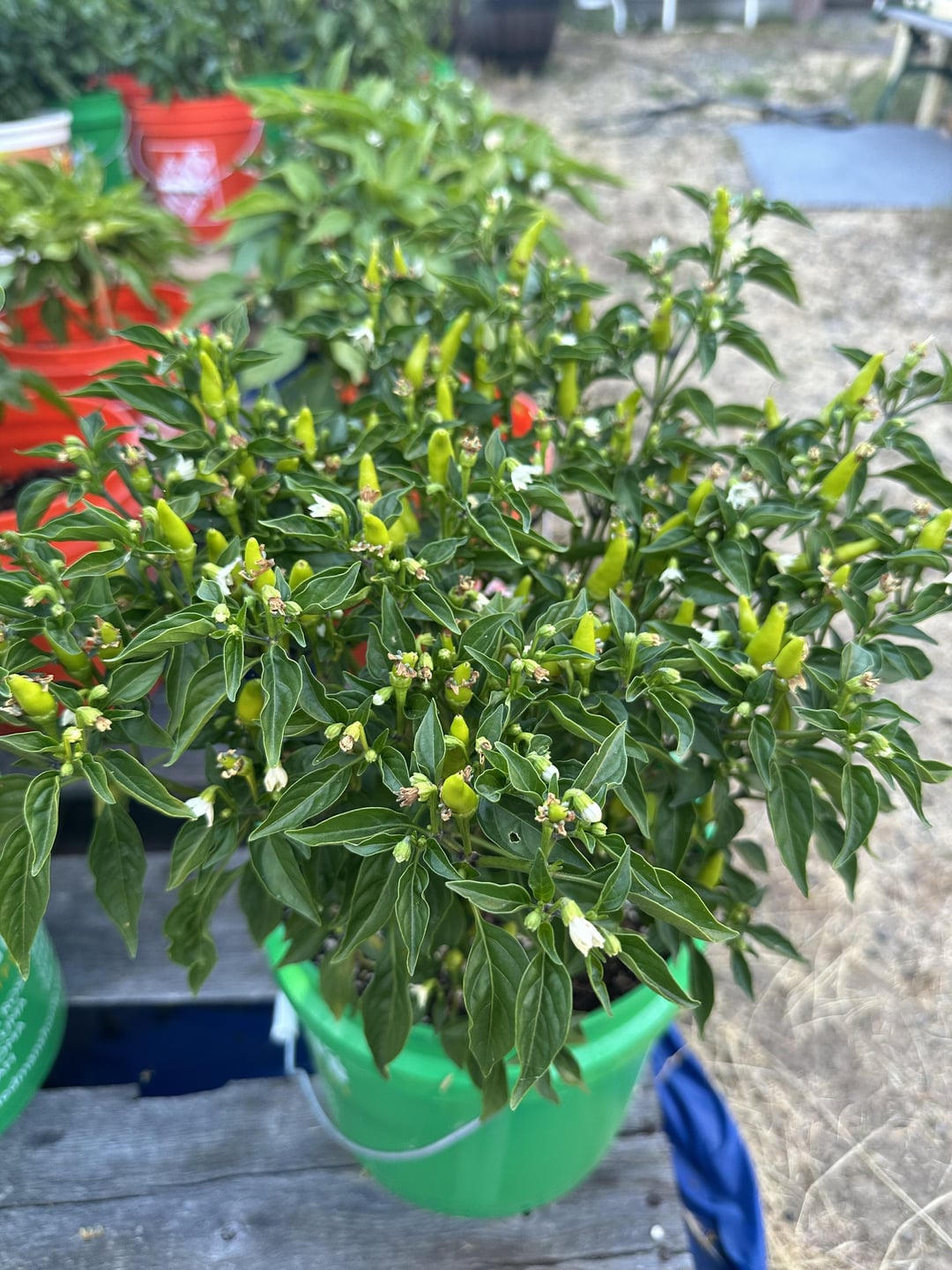 When I left the state for a wedding, everyone had flowers but very few peppers were started. We had the first big heat spell of the year, so I had my grandma water for me every 3 days. Not everyone is producing yet, of course, but I was blown away to see how many peppers had come along on some of them, and relieved to see everyone make it through my absence healthy. (Grandma doesn’t have the greenest of thumbs. Haha)