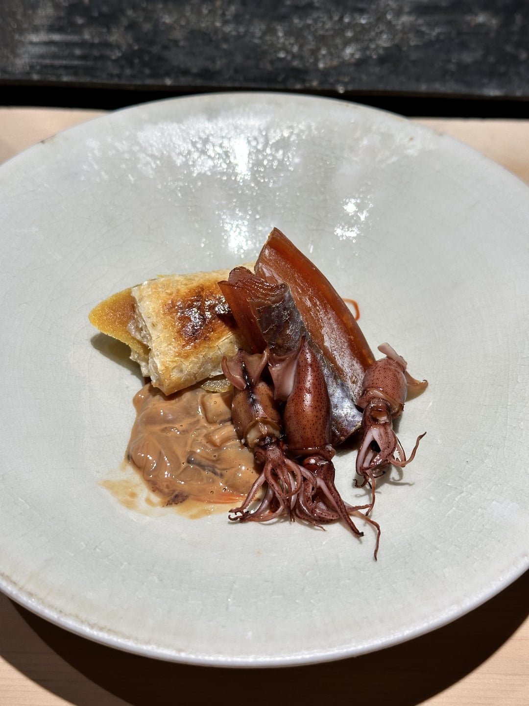 - Mochi Karasumi (bottarga) sandwich, fresh karasumi, hotaru ika (firefly squid), hot smoked jerky bora (mullet), cheriboshi