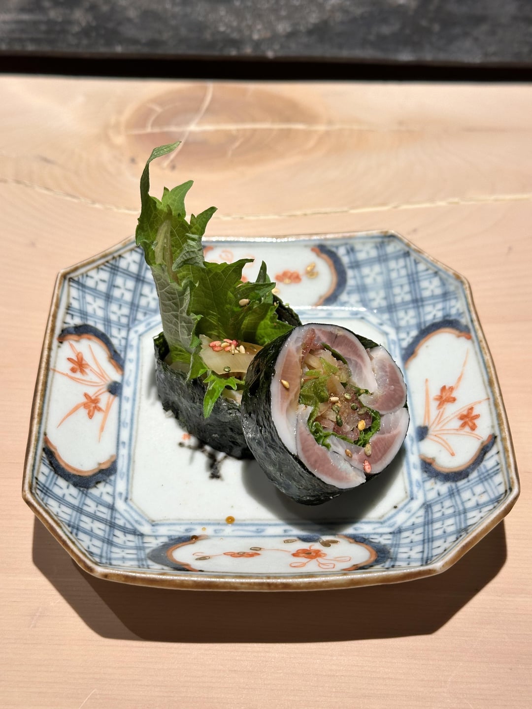- Sardines (iwashi-shime) makizushi with shiso, gari shoga, myoga