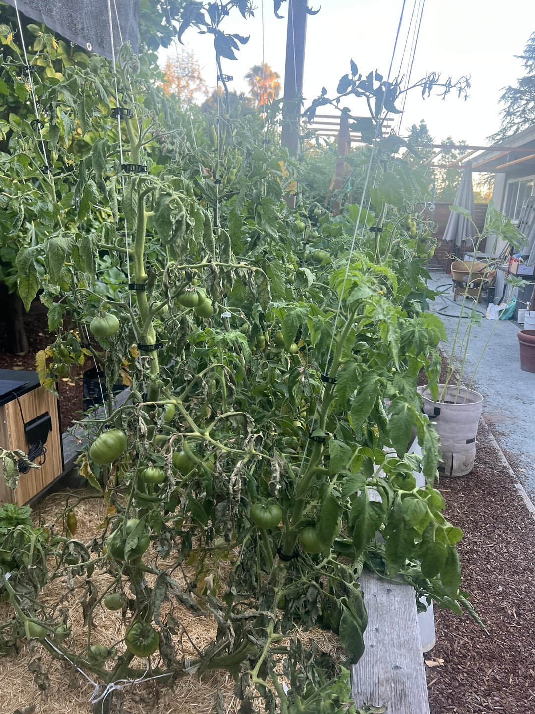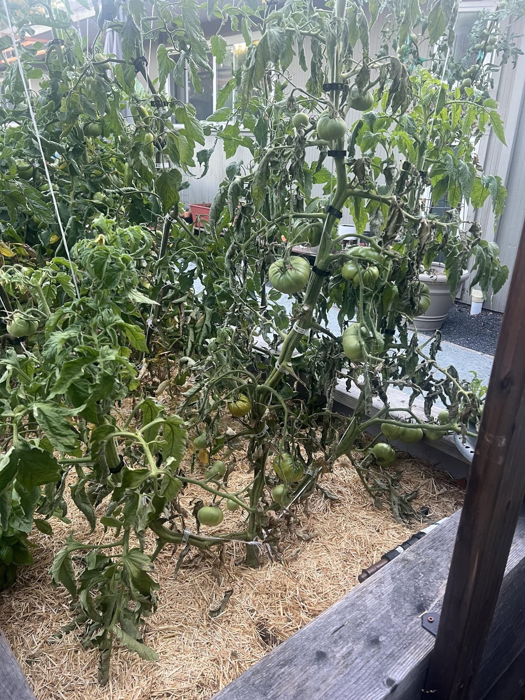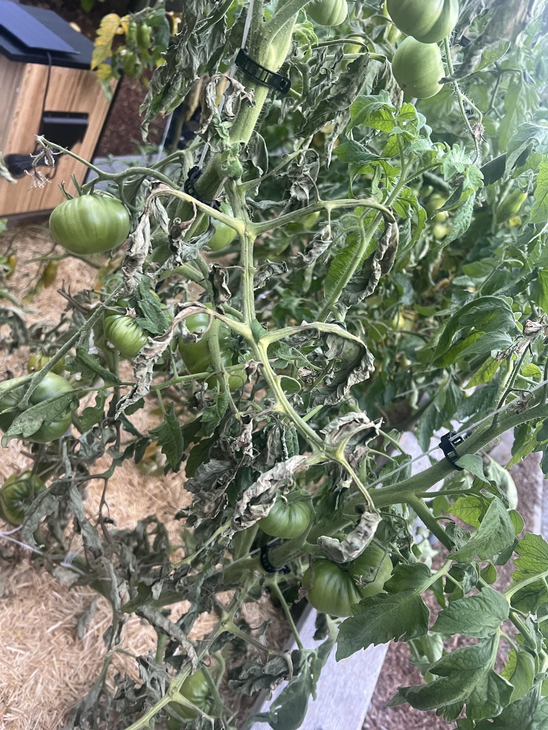 My setup – drip irrigation, water only when a meter reads on the low-side of moist. Amended soil, 40% shade cloth to prevent the mid-day scald, 2’ deep raised beds, vines pruned, training 3 per plant up a string trellis. Fertilized ~2x so far this season with a 4-3-4 fertilizer. Eradicated grubs by hand. These tomatoes get love. I haven’t sprayed much this year for bugs or fungi, thinking curling / yellowing bottom leaves may be heat stress or sun scald vs. fungus. This is the front plant , who gets less protection from the shade cloth. It started when we had a few days at 95+