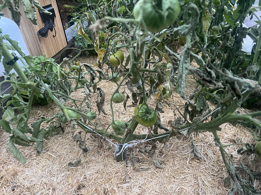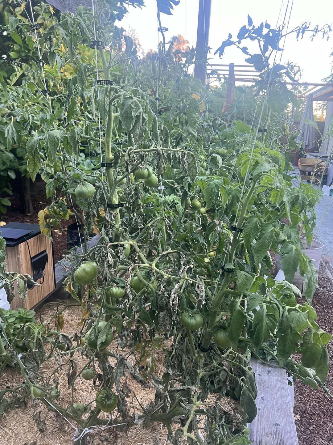 This seems like an annual pattern. My plum Tomatoes start with vigor – healthy, happy, new growth, fruiting heavily, then collapse before ripening end-June. My cherries are prolific. Summers here are hot and dry (zone 9B) with zero rain.