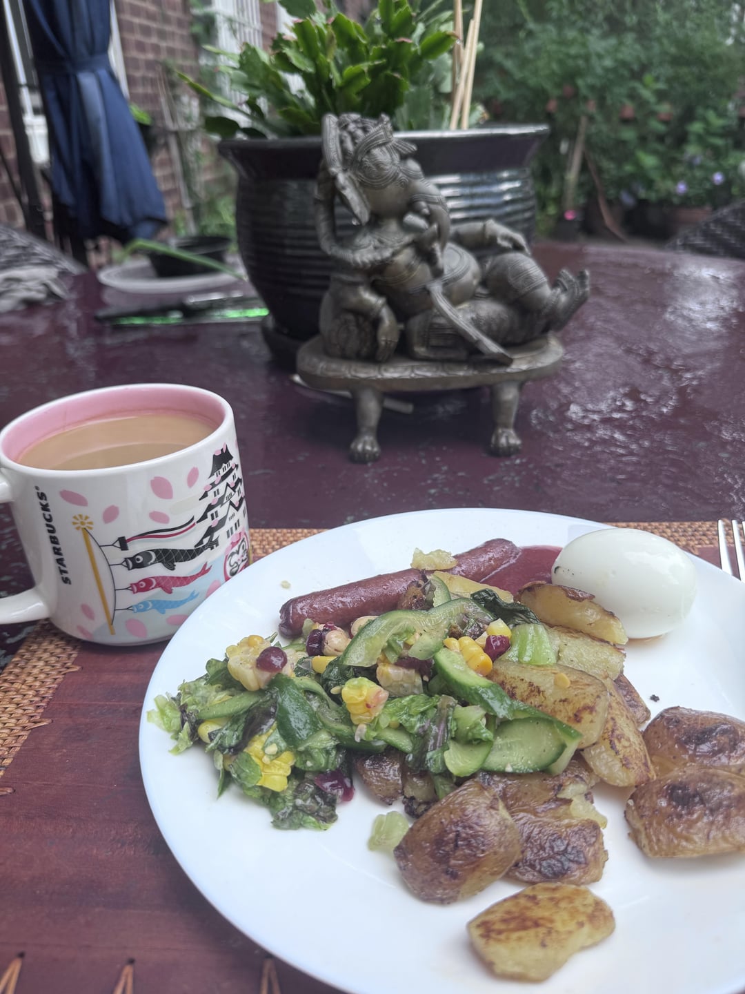A bit damp outside from the nighttime rains but still pleasant – still enjoyed my hard boiled egg, fried potatoes, left over salad, grilled hot dog, ketchup, coffee with coffeemate 😊by Damned_Architect Write A CommentYou must be logged in to post a comment.