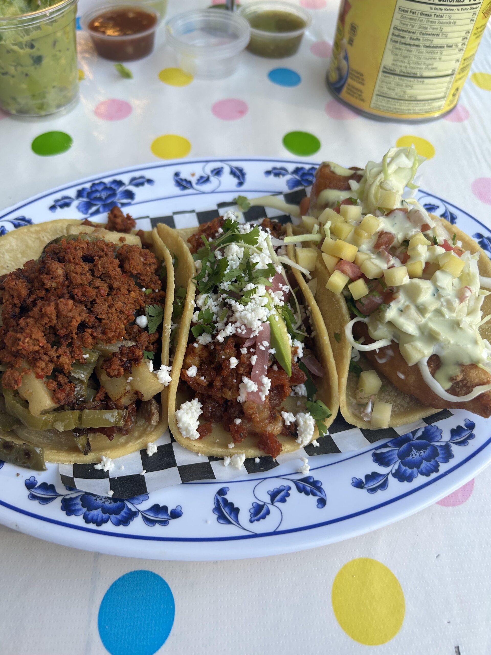 Chorizo on the left, campechano in the middle and paced on the right. All from La Vecindad in San Diego. Pretty solid.